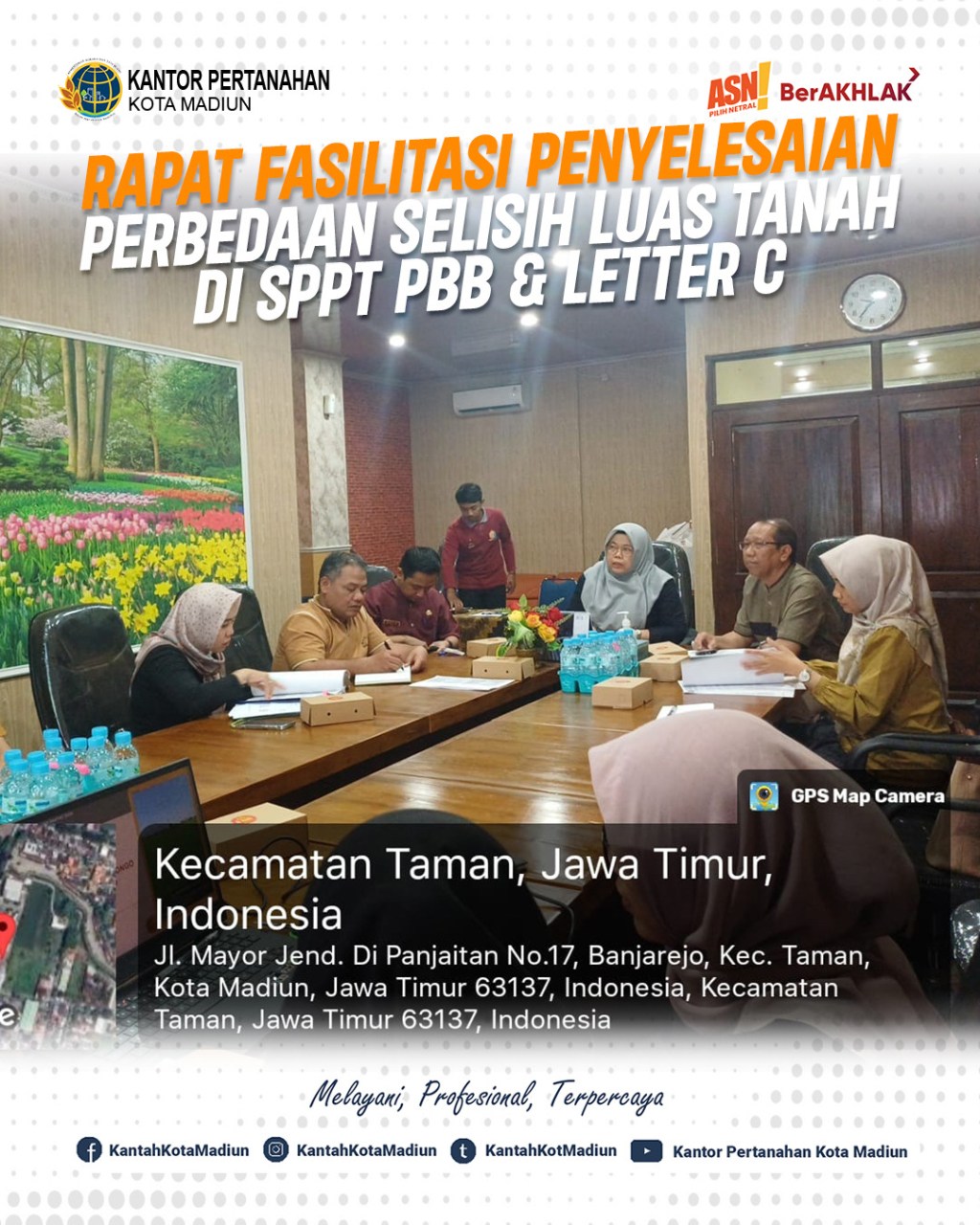 Halo #SobATRBPN, Hari ini Jumat (11/07/2025) Kantor Pertanahan Kota Madiun mengikuti rapat fasilitasi penyelesaian perbedaan selisih luas tanah di SPPT PBB dan Letter C. Turut hadir Koordinator Kelompok Substansi Pengukuran dan Pemetaan Kadastral, Seksi Survei dan Pemetaan, Kantor Pertanahan Kota Madiun.