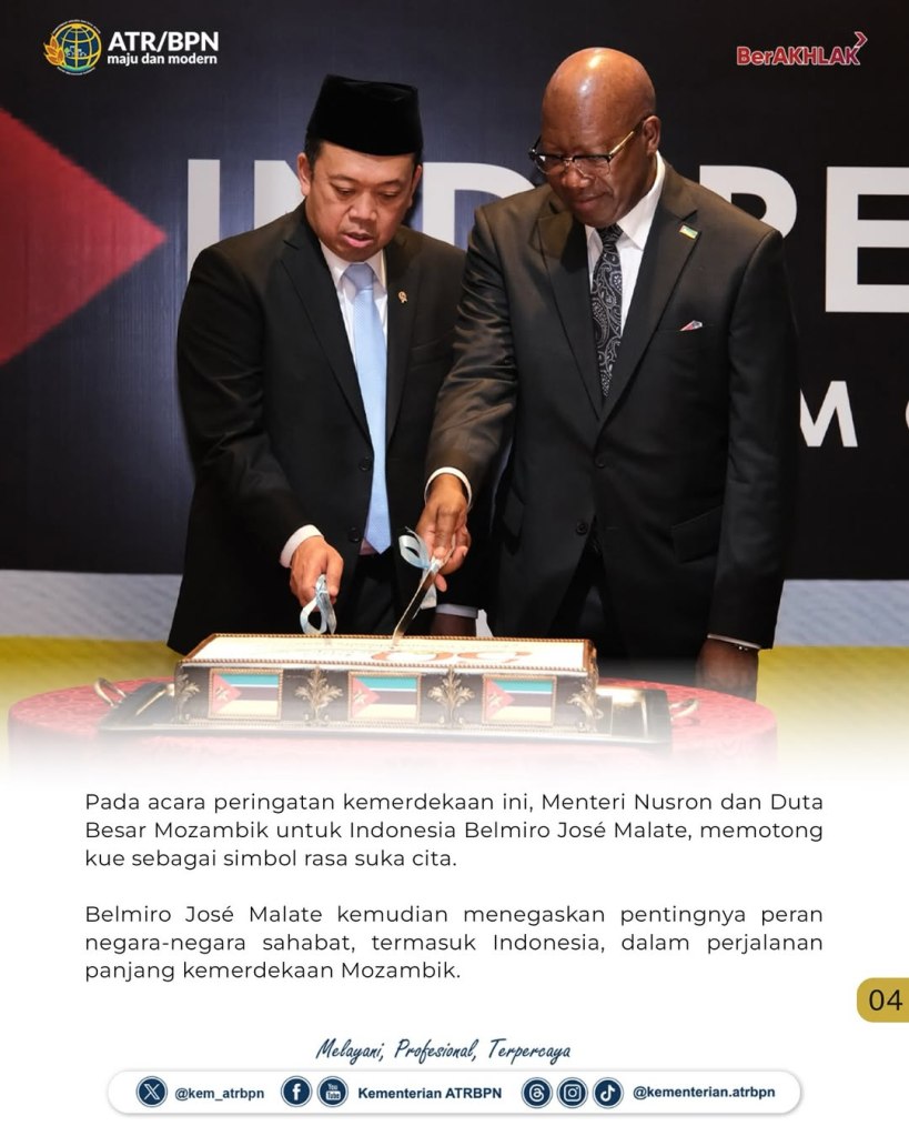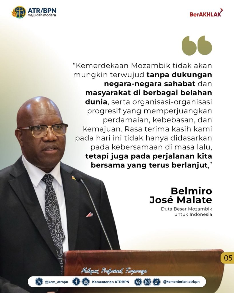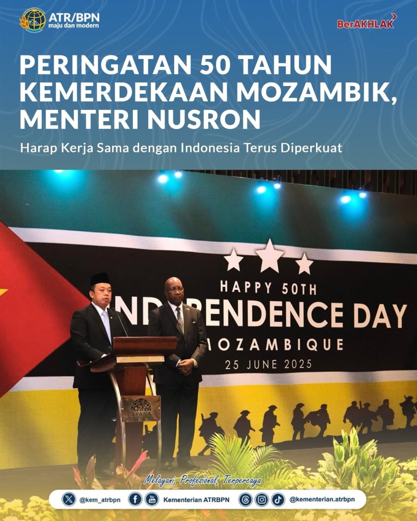 Dalam sambutannya, Menteri Nusron menekankan peringatan emas ini sebagai tonggak bersejarah untuk membuka peluang kerja sama yang lebih luas antara Indonesia dan Mozambik di berbagai bidang.