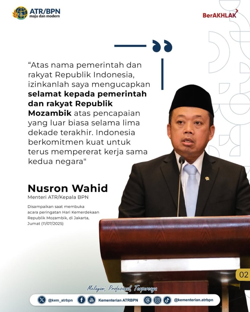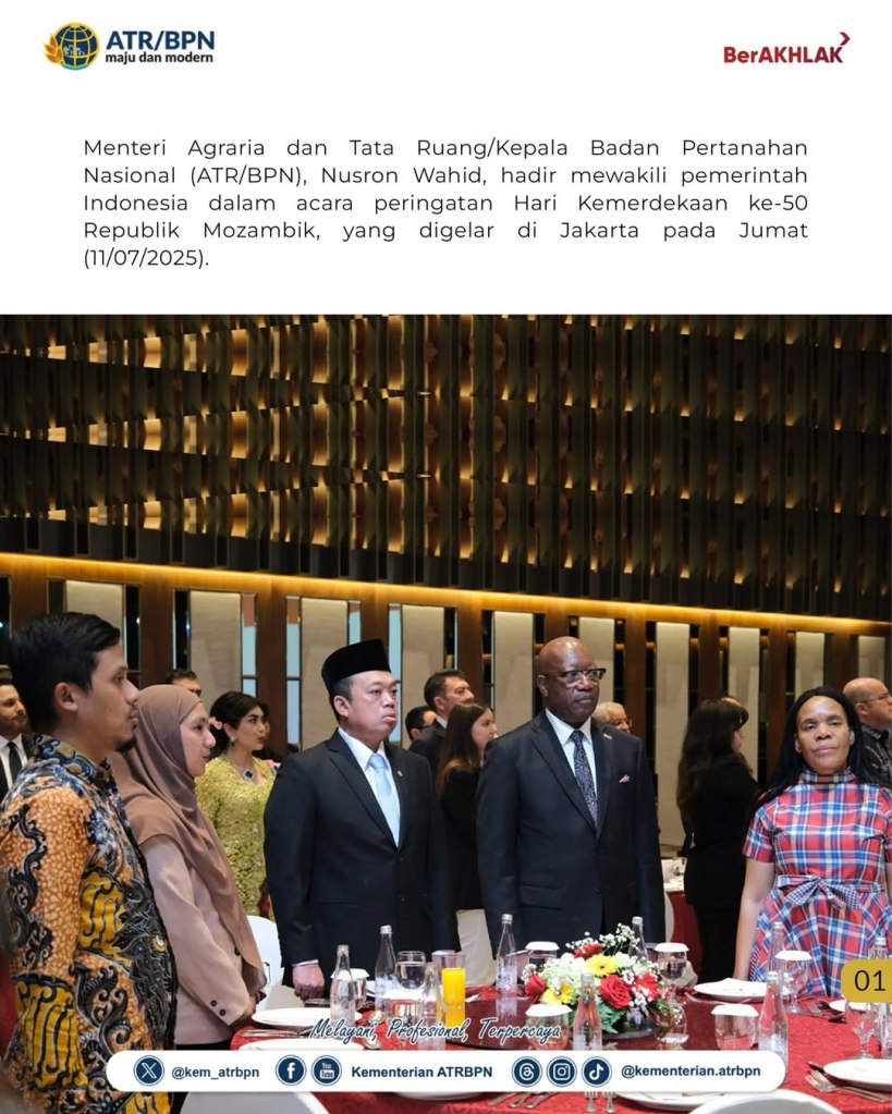 Menteri Agraria dan Tata Ruang/Kepala Badan Pertanahan Nasional (ATR/BPN), Nusron Wahid hadir mewakili pemerintah Indonesia dalam acara peringatan Hari Kemerdekaan ke-50 Republik Mozambik, yang digelar di Jakarta pada Jumat (11/07/2025).