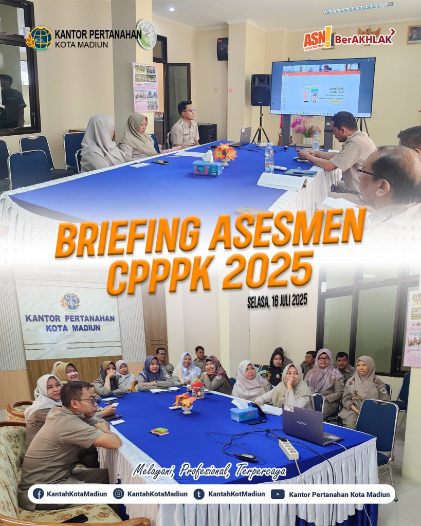 Calon Pegawai Pemerintah dengan Perjanjian Kerja (CPPPK) Kantor Pertanahan Kota Madiun mengikuti kegiatan briefing pelaksanaan Asesmen penilaian kompetensi bagi PPPK Tahun 2025 yang diselenggarakan oleh Kementerian Agraria dan Tata Ruang/Badan Pertanahan Nasional (ATR/BPN). Kegiatan ini dilaksanakan secara daring dan diikuti oleh seluruh peserta dari satuan kerja ATR/BPN di seluruh Indonesia.