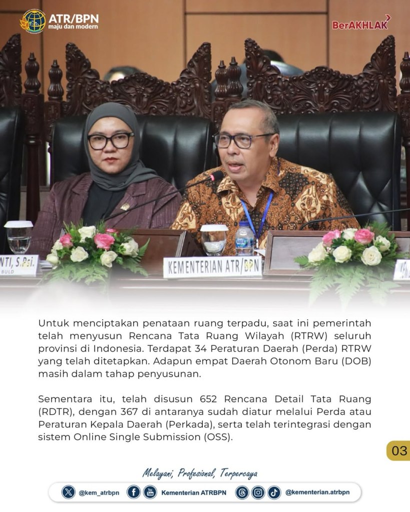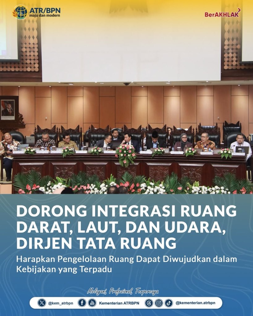 Direktur Jenderal Tata Ruang, Kementerian Agraria dan Tata Ruang/Badan Pertanahan Nasional (ATR/BPN), Suyus Windayana, menegaskan komitmennya dalam mendorong integrasi tata ruang darat, laut, udara, dan bawah permukaan. Hal ini dilakukan sebagai bagian dari upaya menghadirkan kebijakan penataan ruang yang terpadu dan adaptif.