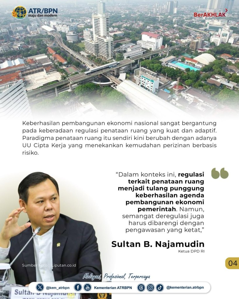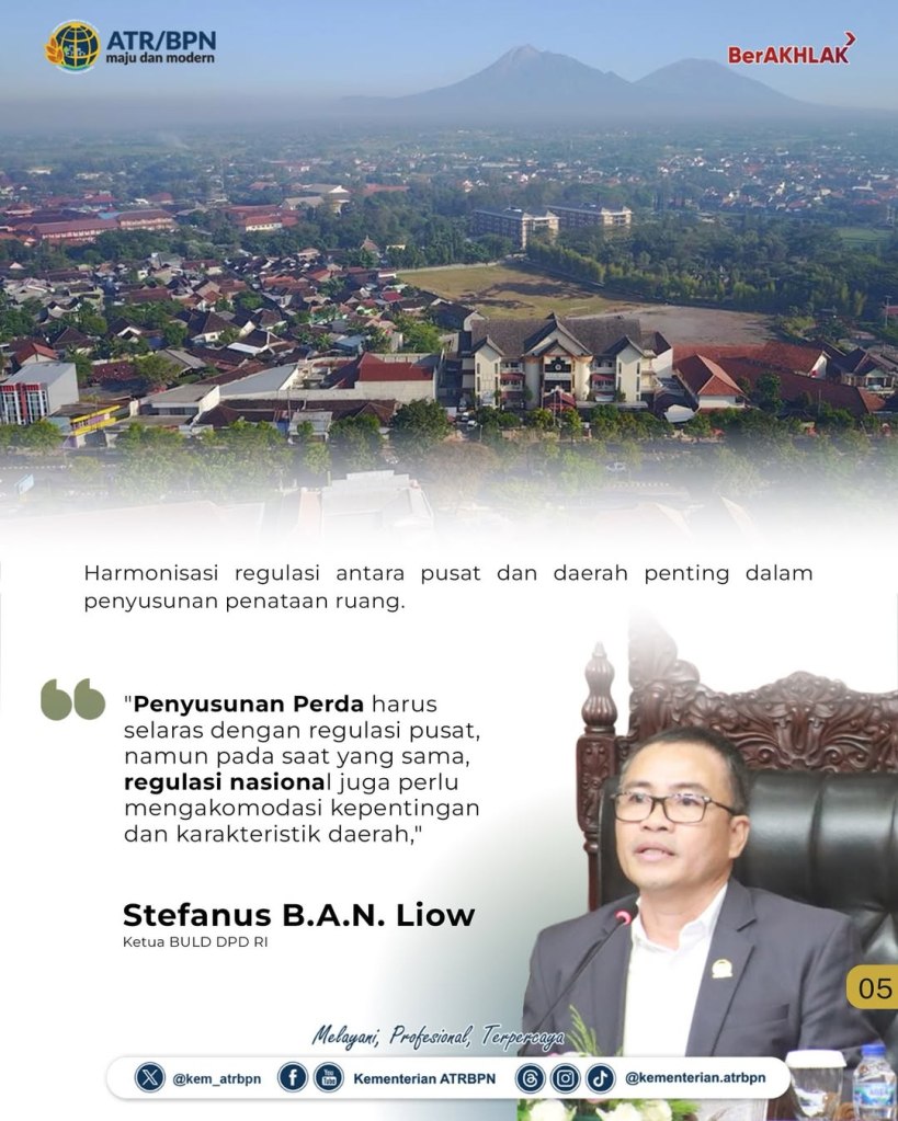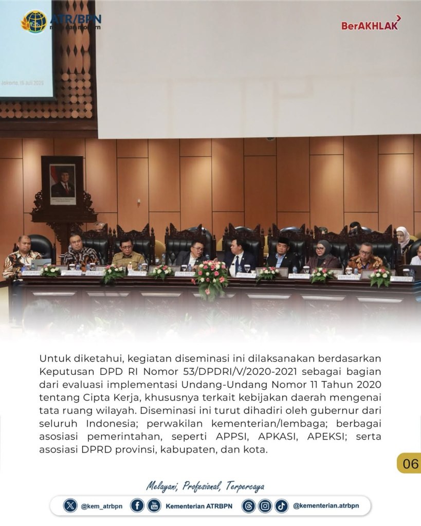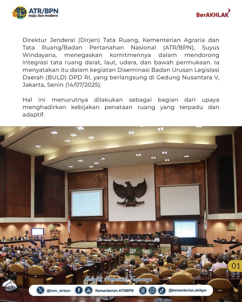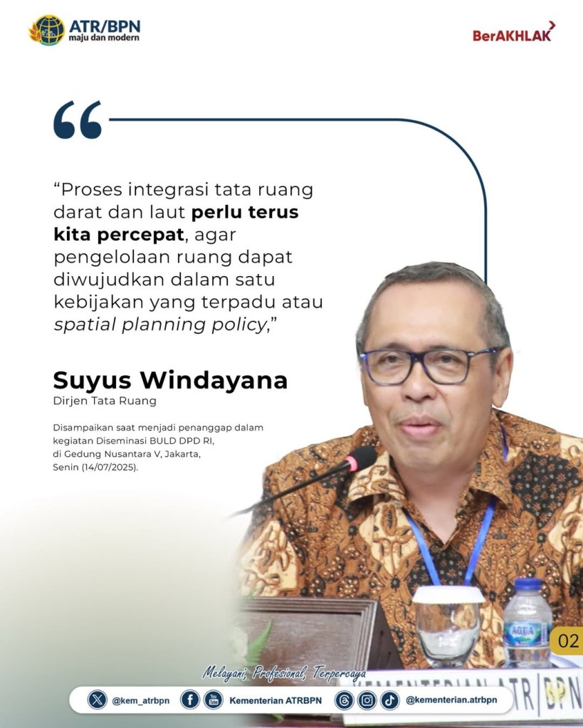 “Proses integrasi tata ruang darat dan laut perlu terus kita percepat, agar pengelolaan ruang dapat diwujudkan dalam satu kebijakan yang terpadu atau spatial planning policy” ujar Suyus Windayana saat menjadi penanggap dalam kegiatan Diseminasi Badan Urusan Legislasi Daerah (BULD) DPD RI, yang berlangsung di Gedung Nusantara V, Kompleks Parlemen Senayan, Senin (14/07/2025).