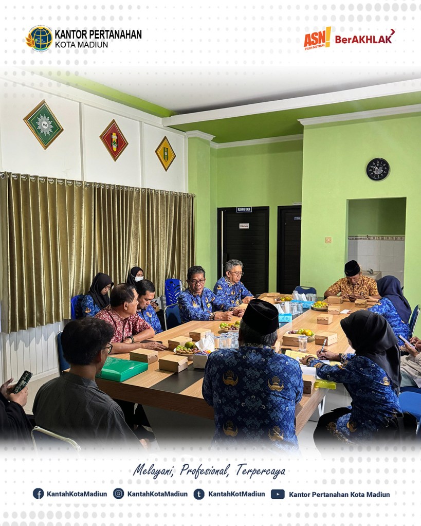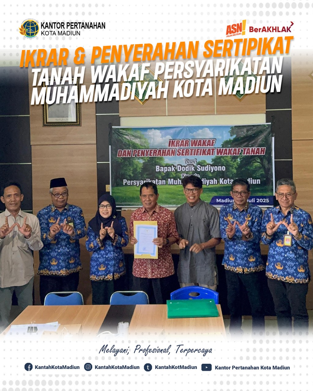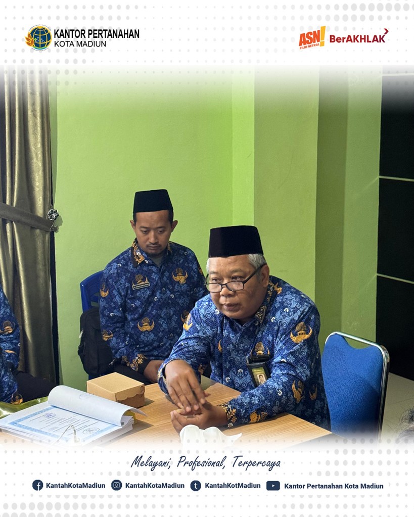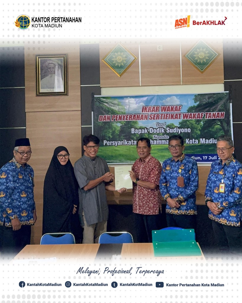 Halo #SobATRBPN, Hari ini Kamis (17/07/2025) Kepala Kantor Pertanahan Kota Madiun, Bapak Triawan Saleh, S.T., M.Si. ditemani dengan Kepala Seksi Survei dan Pemetaan, Bapak Agus Cahyadi, S.ST., M.H. dan Kepala Seksi Penetapan Hak dan Pendaftaran, Bapak R. Rusmarjanto Atmadi, A.Ptnh., M.M. menyaksikan ikrar wakaf dan penyerahan Sertipikat Tanah Wakaf Persyarikatan Muhammadiyah Kota Madiun.