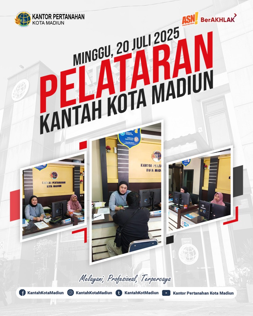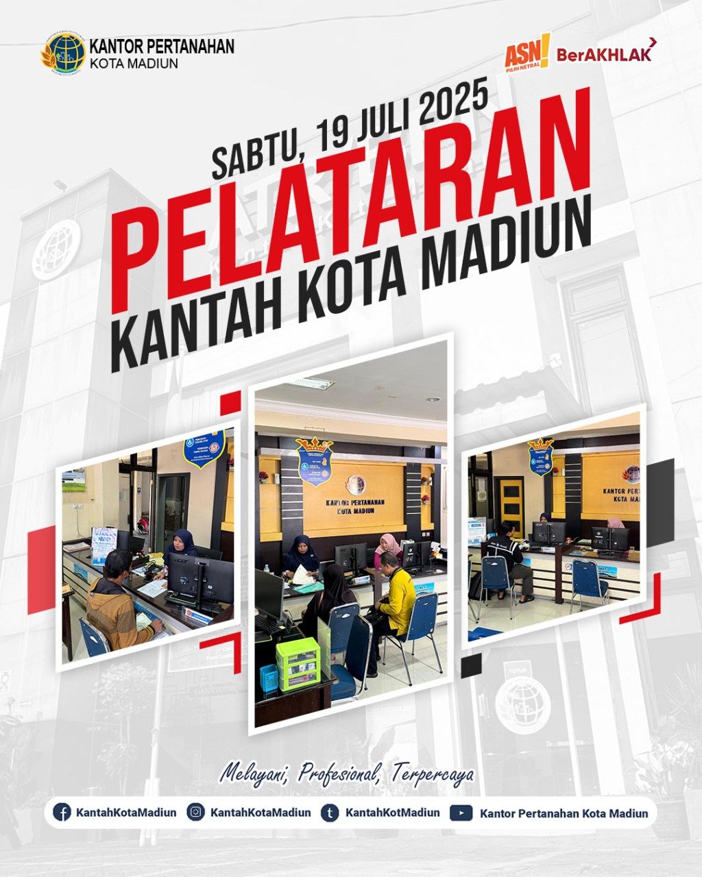 Halo #SobATRBPN, Kantor Pertanahan Kota Madiun kembali menghadirkan layanan Pelataran (Pelayanan Tanah Akhir Pekan), pada hari Sabtu dan Minggu. Kamu bisa mendatangi loket Pelataran untuk mendapatkan berbagai layanan, mulai dari roya sertipikat, permohonan informasi, hingga permohonan sertipikat pengganti karena hilang.