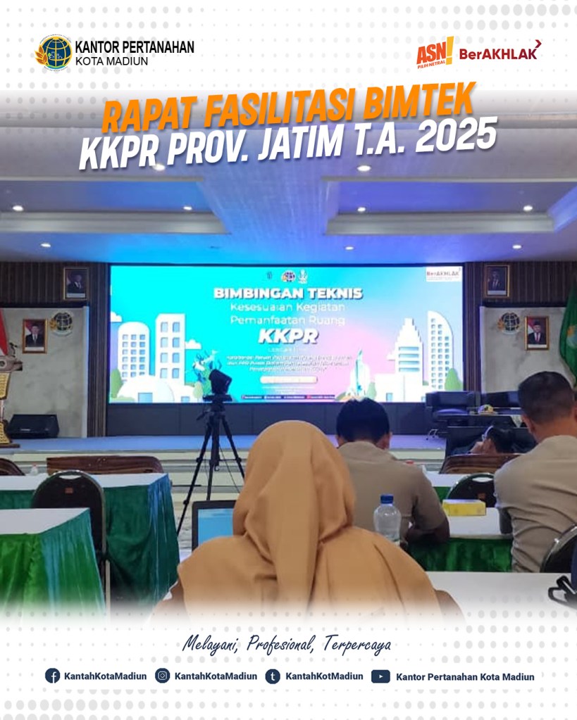 Hari ini Senin (11/08/2025) Kantor Pertanahan Kota Madiun mengikuti rapat fasilitasi Bimbingan Teknis Kesesuaian Kegiatan Pemanfaatan Ruang (KKPR) Provinsi Jawa Timur Tahun Anggaran 2025. Turut hadir Kepala Seksi Penataan dan Pemberdayaan, Bapak Dwi Joko Susilo, A.Ptnh., M.M.