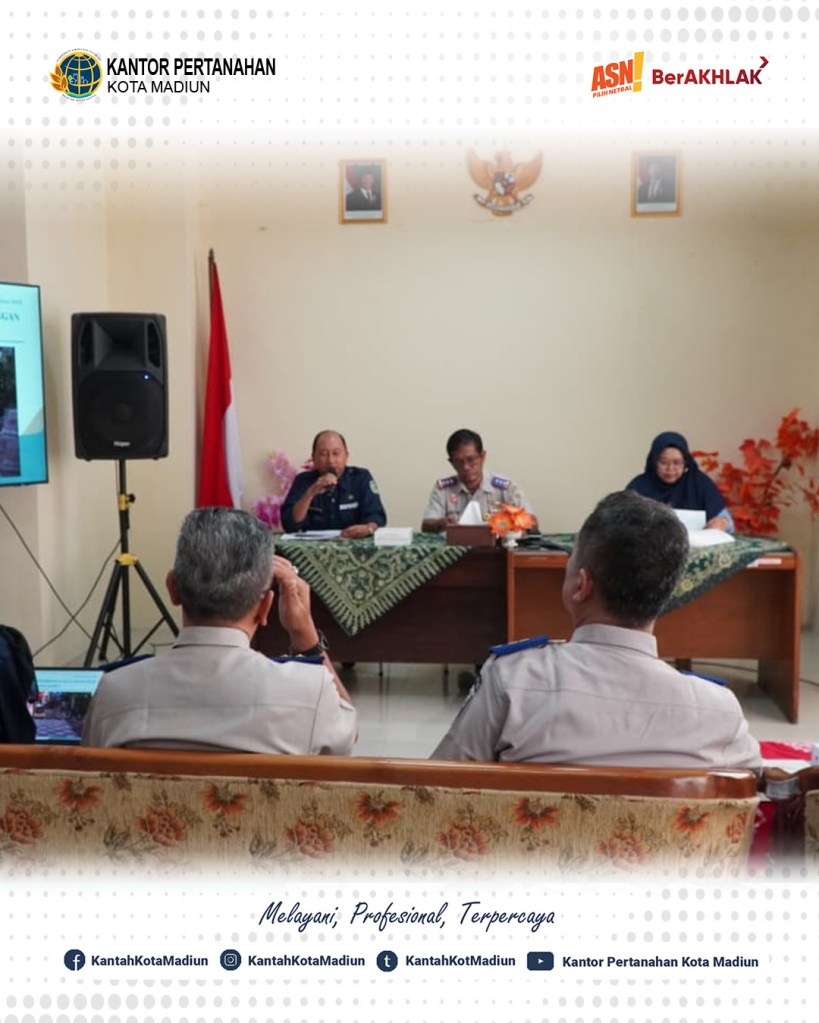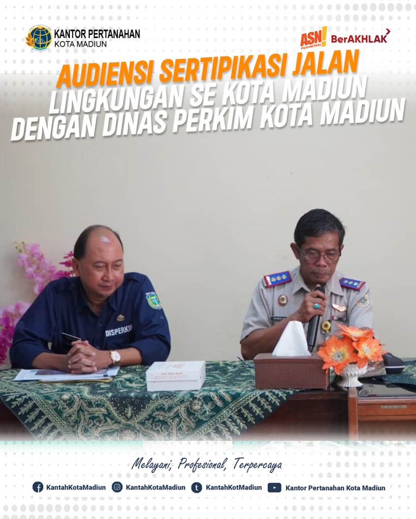 Hari ini Selasa (19/08/2025) Kantor Pertanahan Kota Madiun menerima audiensi dari Dinas Perumahan Rakyat dan Kawasan Permukiman perihal sertipikasi Jalan Lingkungan se Kota Madiun. Turut hadir Kepala Kantor Pertanahan Kota Madiun, Bapak Triawan Saleh, S.T., M.Si. dan ditemani dengan Seluruh Pejabat Pengawas Kantor Pertanahan Kota Madiun.