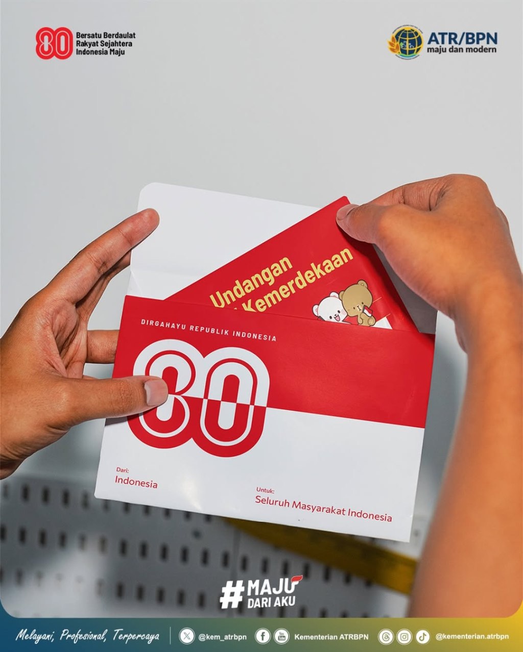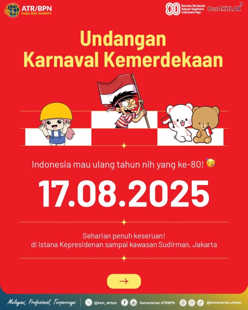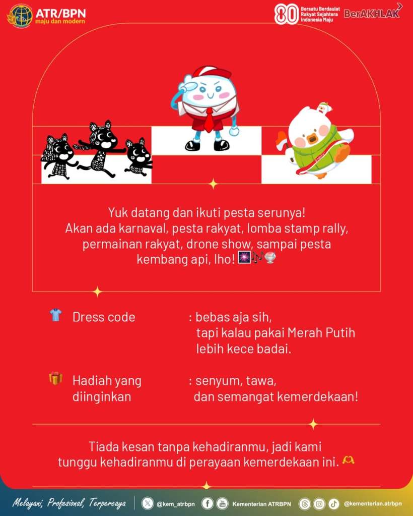 Halo #SobATRBPN, jangan lewatkan perayaan puncak Hari Ulang Tahun ke-80 Republik Indonesia yang akan digelar di Jakarta, yaa