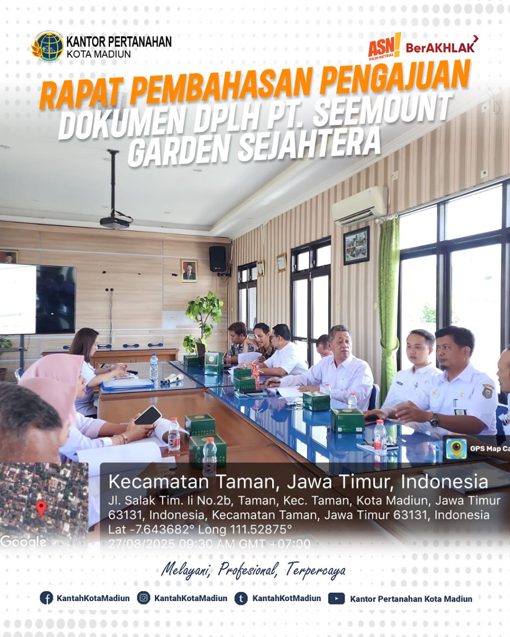 Halo #SobATRBPN, Hari ini Rabu (27/08/2025) Kantor Pertanahan Kota Madiun mengikuti rapat pembahasan pengajuan dokumen DPLH PT. Seemount Garden Sejahtera (Perumahan Green Garden Asri). Turut hadir Kepala Seksi Penataan dan Pemberdayaan, Bapak Dwi Joko Susilo, A.Ptnh., M.M. ditemani dengan Penata Pertanahan Ahli Pertama.