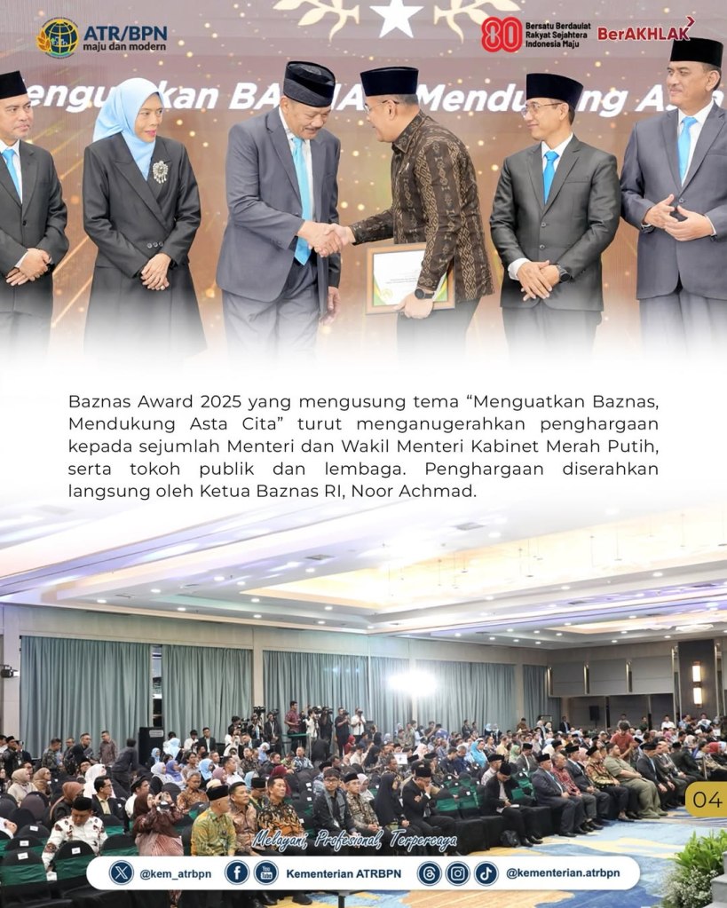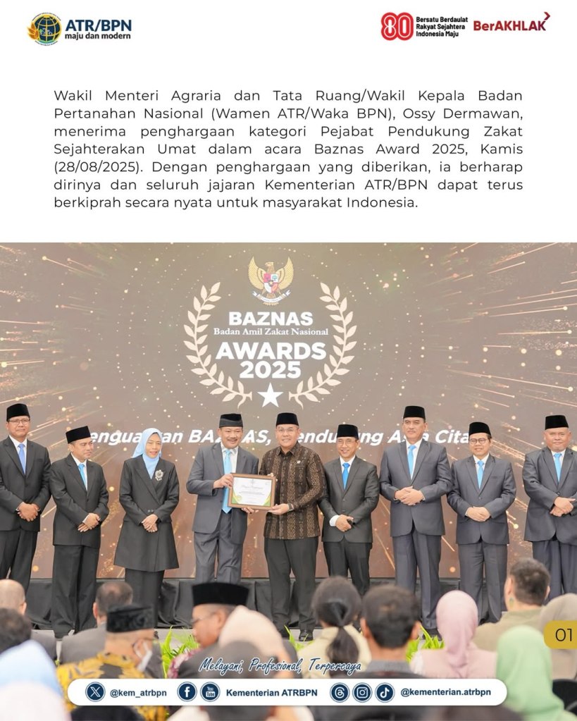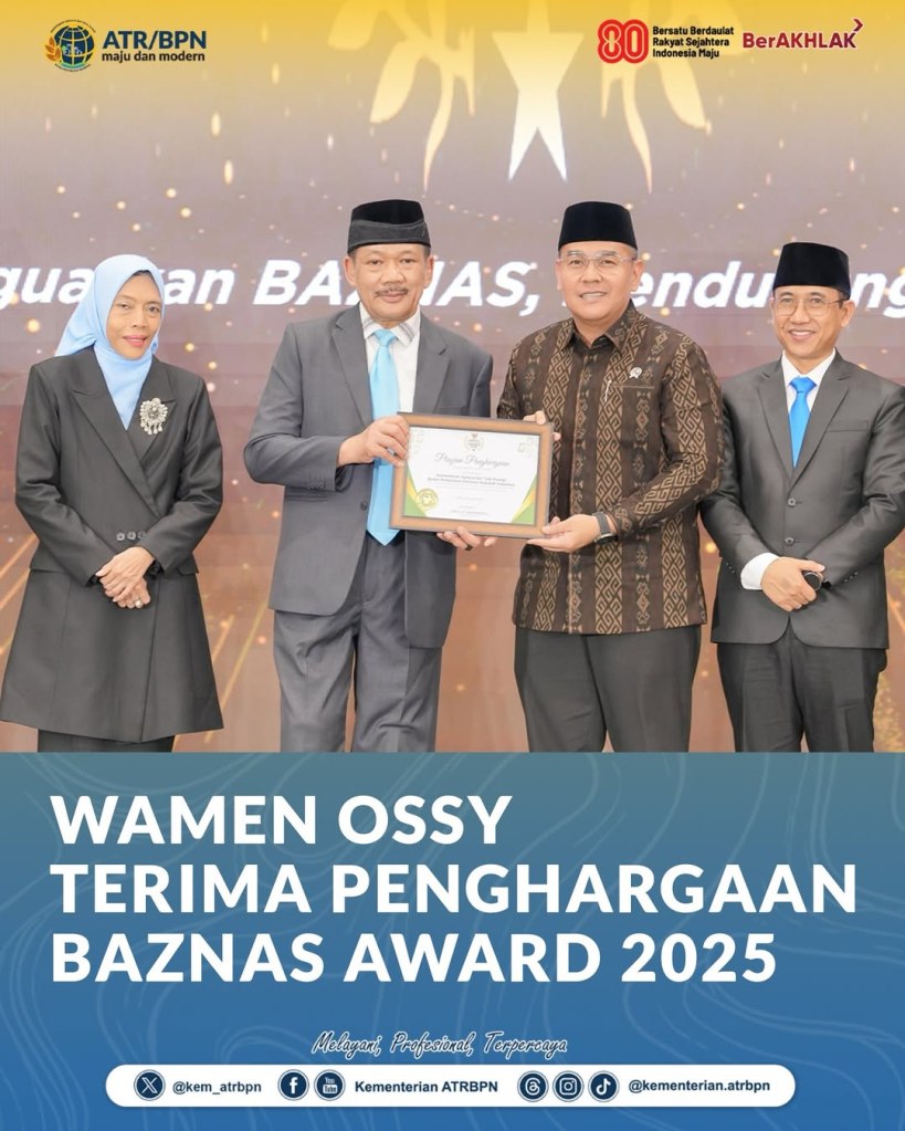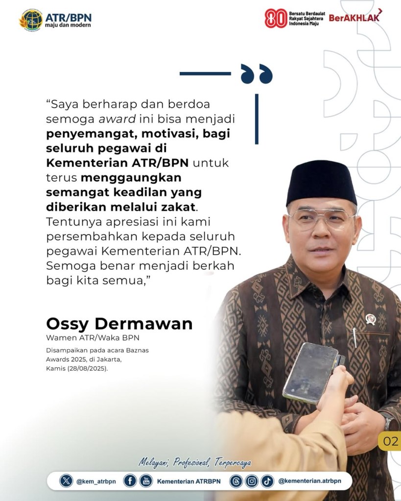 Wakil Menteri Agraria dan Tata Ruang/Wakil Kepala Badan Pertanahan Nasional (Wamen ATR/Waka BPN), Ossy Dermawan, menerima penghargaan kategori Pejabat Pendukung Zakat Sejahterakan Umat dalam acara Baznas Award 2025, Kamis (28/08/2025). Dengan penghargaan yang diberikan, ia berharap dirinya dan seluruh jajaran Kementerian ATR/BPN dapat terus berkiprah secara nyata untuk masyarakat Indonesia.
