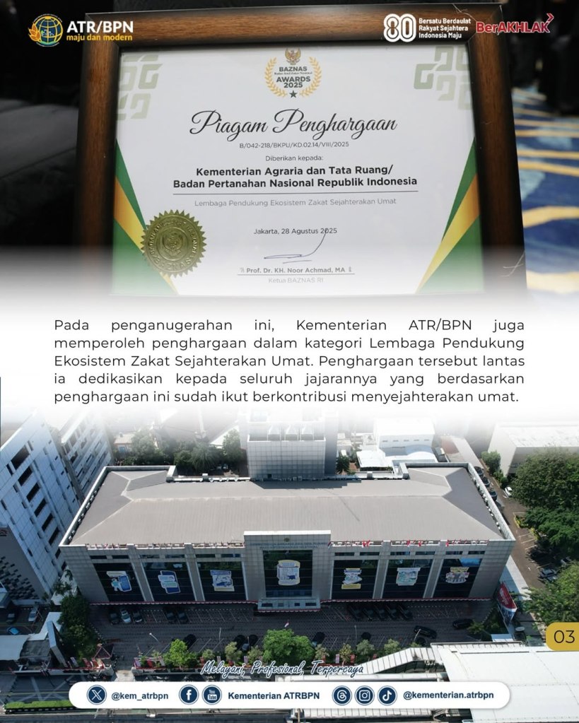 “Saya berharap dan berdoa semoga award ini bisa menjadi penyemangat, motivasi, bagi seluruh pegawai di Kementerian ATR/BPN untuk terus menggaungkan semangat keadilan yang diberikan melalui zakat,” ucap Wamen Ossy usai menerima penghargaan, di Jakarta pada Kamis (28/08/2025).