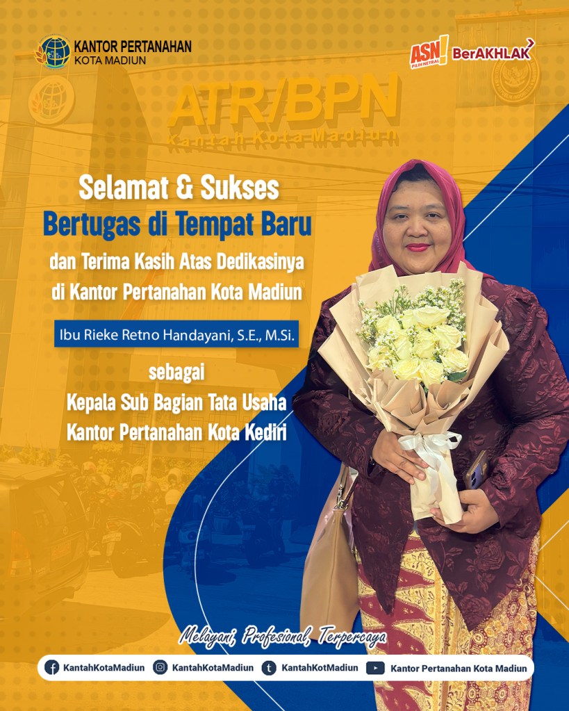 Segenap Jajaran Kantor Pertanahan Kota Madiun Mengucapkan Selamat dan Sukses atas dilantiknya Ibu Rieke Retno Handayani, S.E., M.Si. sebagai Kepala Sub Bagian Tata Usaha Kantor Pertanahan Kota Kediri.