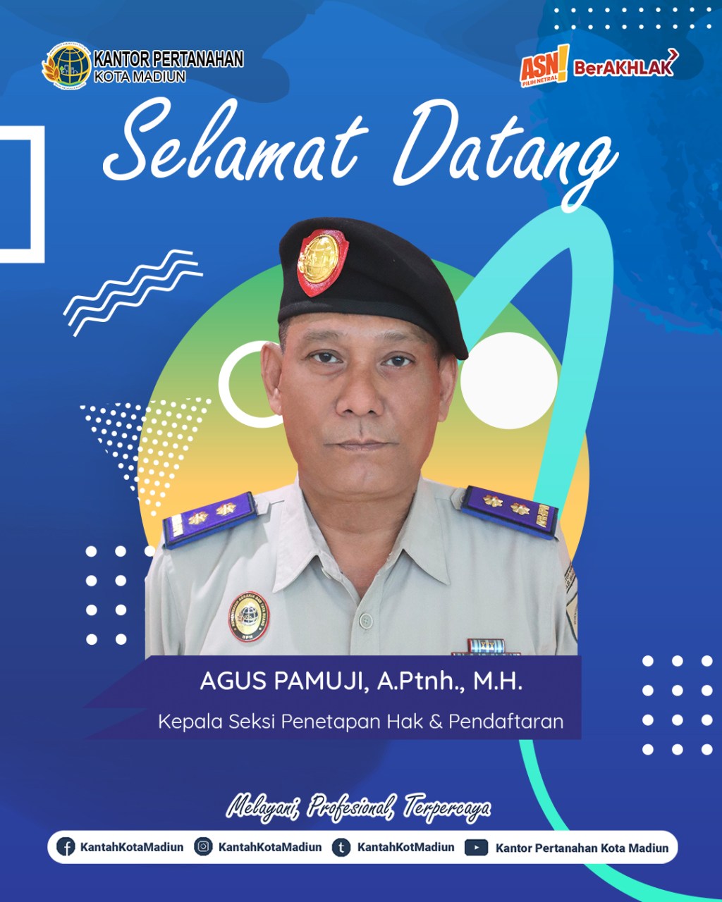 Segenap Jajaran Kantor Pertanahan Kota Madiun Mengucapkan Selamat dan Sukses atas dilantiknya Bapak Agus Pamuji, A.Ptnh., M.H. sebagai Kepala Seksi Penetapan Hak dan Pendaftaran Kantor Pertanahan Kota Madiun.