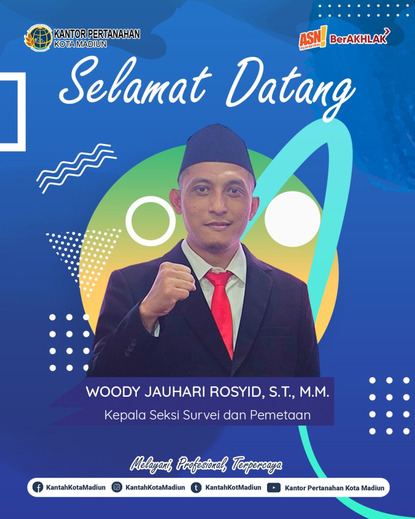 Segenap Jajaran Kantor Pertanahan Kota Madiun Mengucapkan Selamat dan Sukses atas dilantiknya Bapak Woody Jauhari Rosyid, S.T., M.M. sebagai Kepala Seksi Survei dan Pemetaan Kantor Pertanahan Kota Madiun.