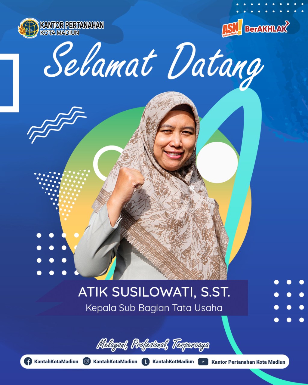 Segenap Jajaran Kantor Pertanahan Kota Madiun Mengucapkan Selamat dan Sukses atas dilantiknya Ibu Atik Susilowati, S.ST. sebagai Kepala Sub Bagian Tata Usaha Kantor Pertanahan Kota Madiun.