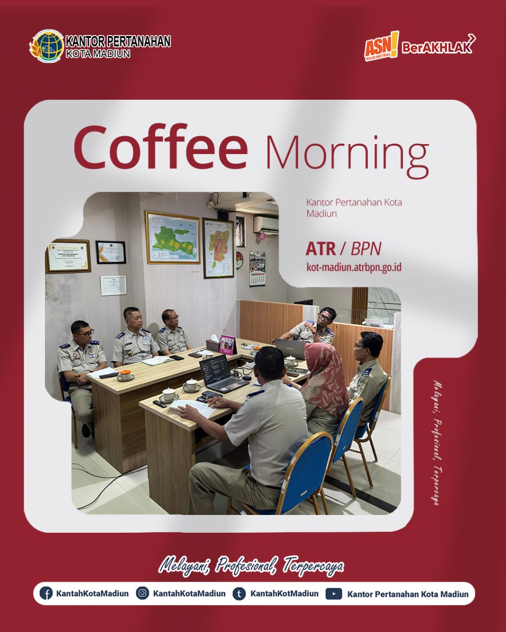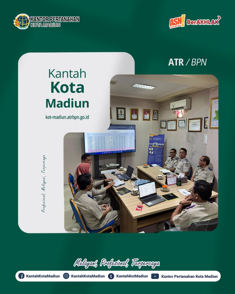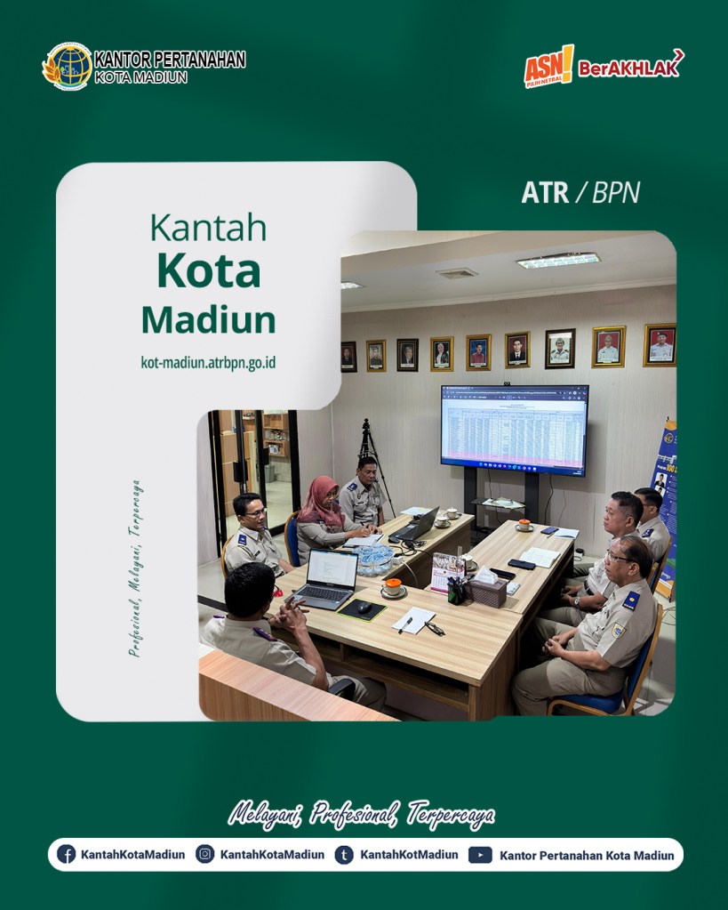 Hari ini Senin (15/09/2025) Kantor Pertanahan Kota Madiun melaksanakan Coffee Morning sekaligus Rapat Koordinasi. Pada Coffee Morning Kali ini Kantor Pertanahan Kota Madiun melakukan evaluasi kegiatan sepekan sebelumnya dan rencana kegiatan yang akan dilaksanakan dalam pekan depan. Rapat kali ini dipimpin oleh Kepala Kantor Pertanahan Kota Madiun, Bapak Triawan Saleh, S.T., M.Si. dan diikuti oleh Seluruh Pejabat Pengawas Kantor Pertanahan Kota Madiun.