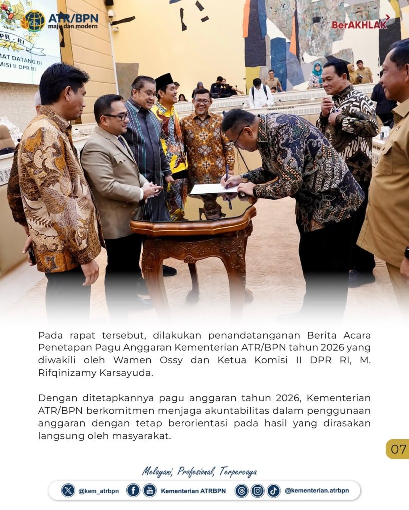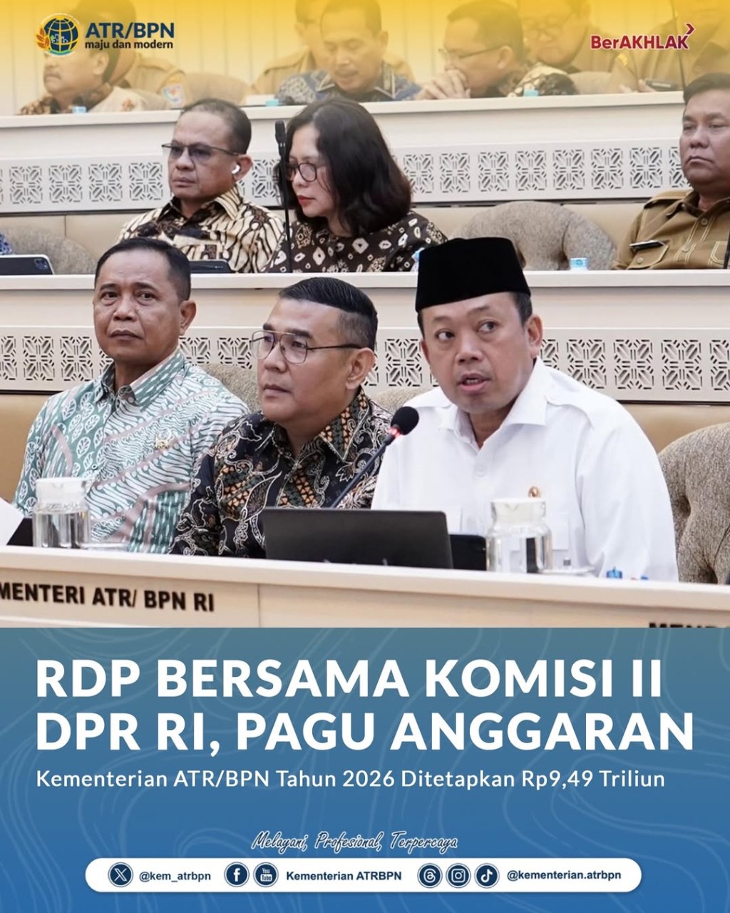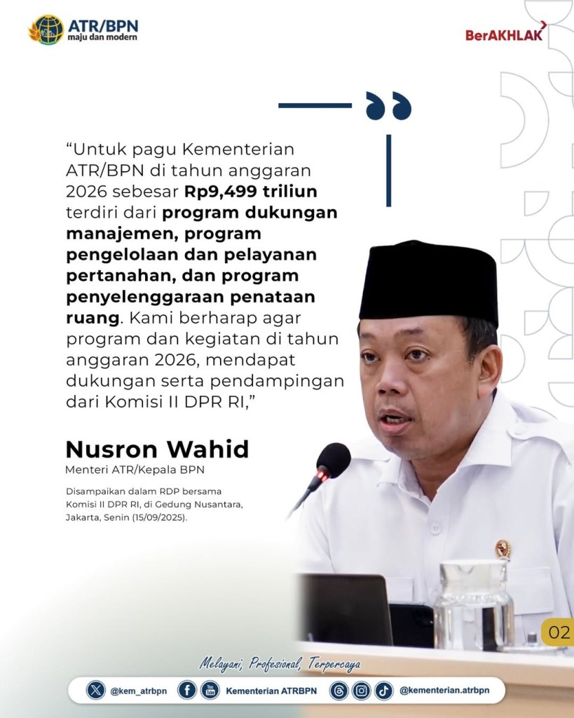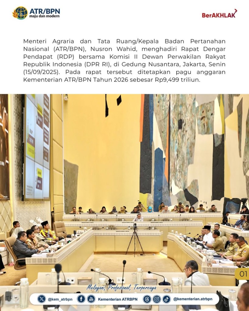 Menteri Agraria dan Tata Ruang/Kepala Badan Pertanahan Nasional (ATR/BPN), Nusron Wahid, menghadiri Rapat Dengar Pendapat (RDP) bersama Komisi II Dewan Perwakilan Rakyat Republik Indonesia (DPR RI), di Gedung Nusantara, Jakarta, Senin (15/09/2025). Pada rapat tersebut ditetapkan pagu anggaran Kementerian ATR/BPN Tahun 2026 sebesar Rp9,499 triliun.