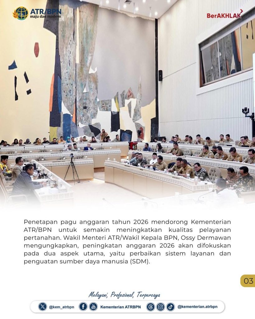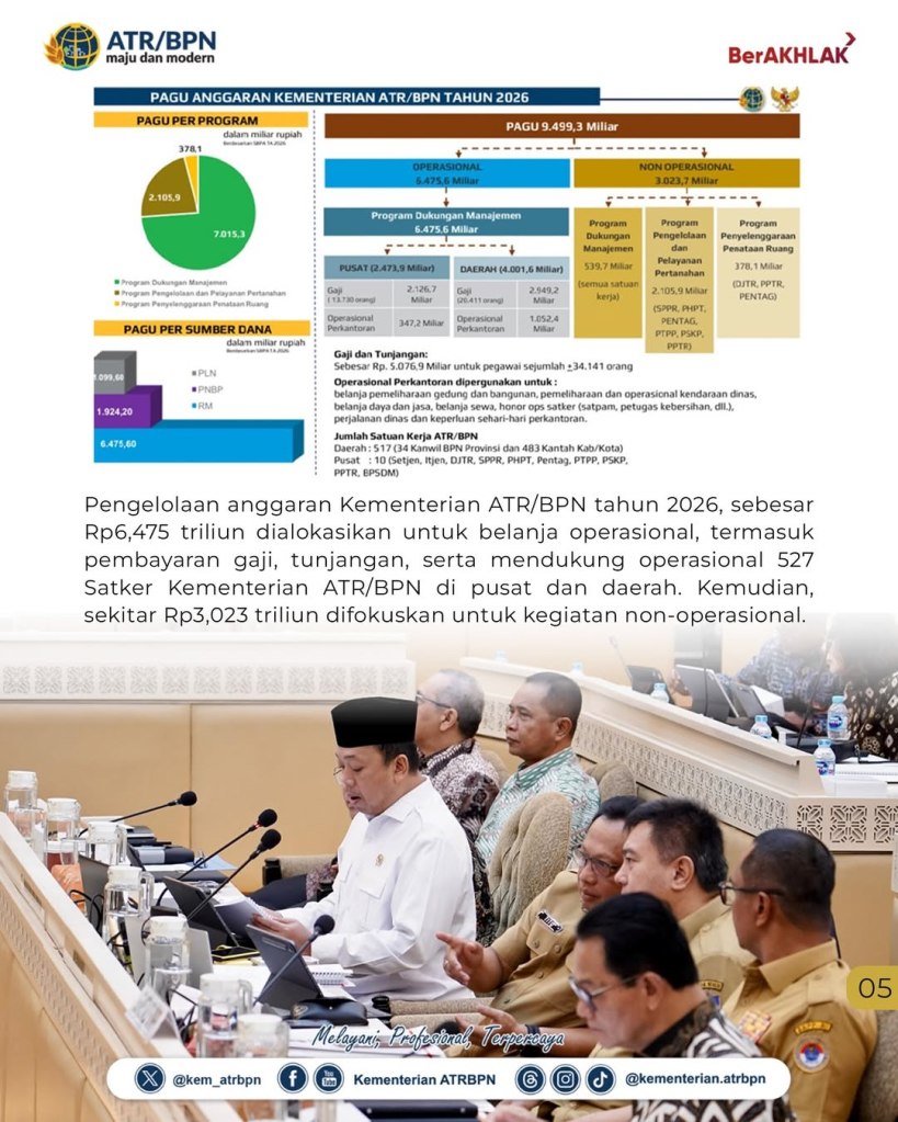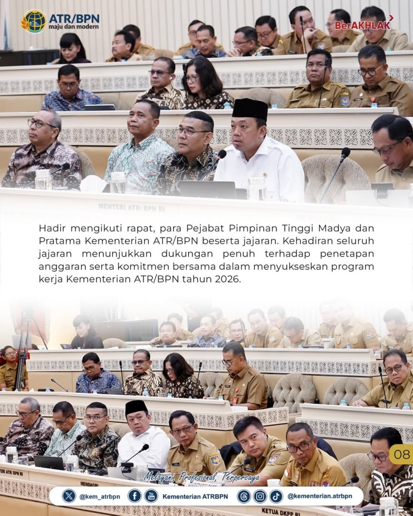 “Untuk pagu Kementerian ATR/BPN di tahun anggaran 2026 sebesar Rp9,499 triliun terdiri dari program dukungan manajemen, program pengelolaan dan pelayanan pertanahan, dan program penyelenggaraan penataan ruang,” terang Menteri Nusron yang hadir dalam RDP didampingi oleh Wakil Menteri (Wamen) ATR/Wakil Kepala (Waka) BPN, Ossy Dermawan.