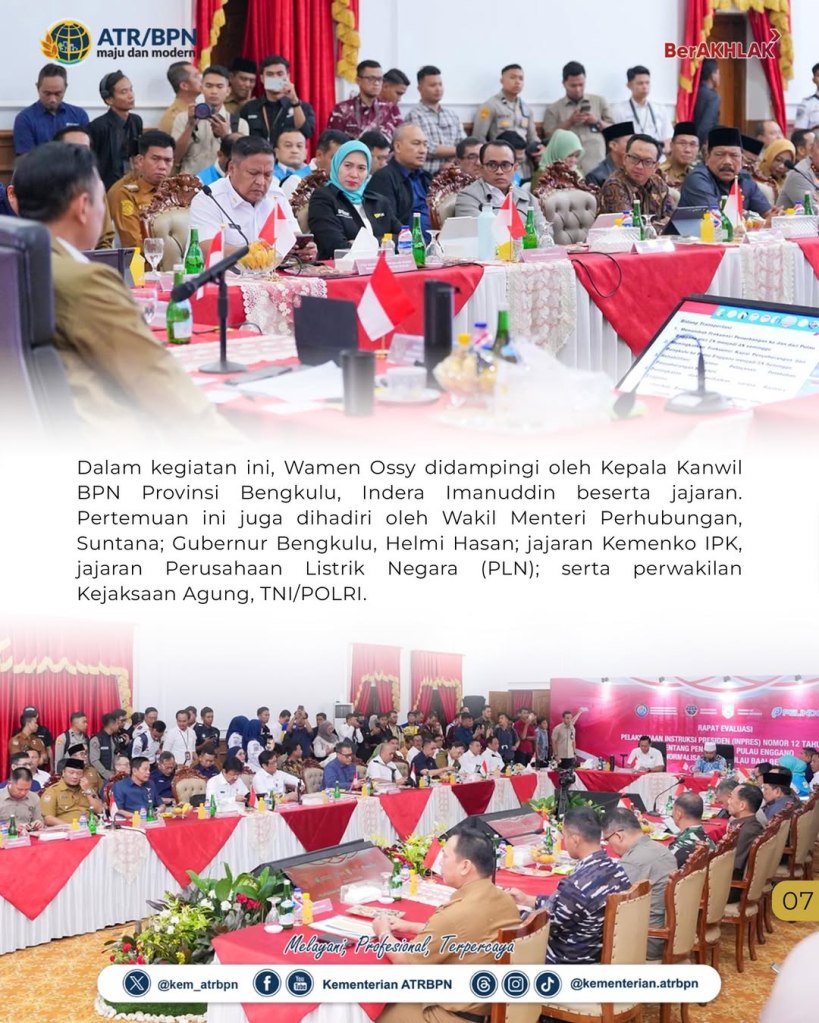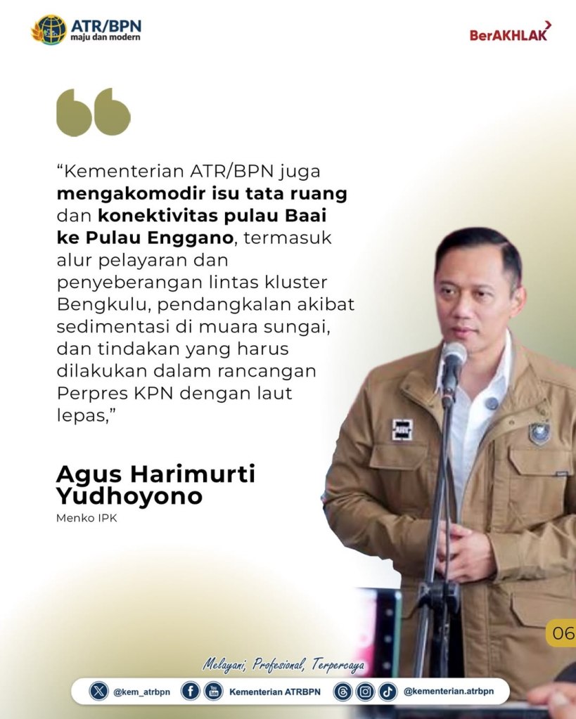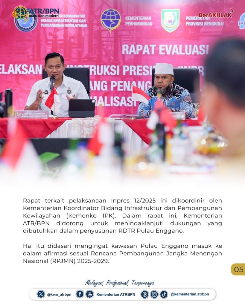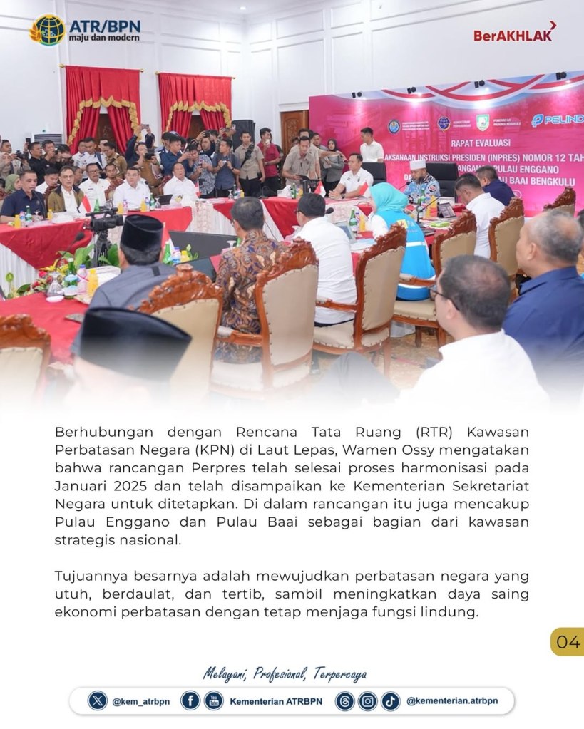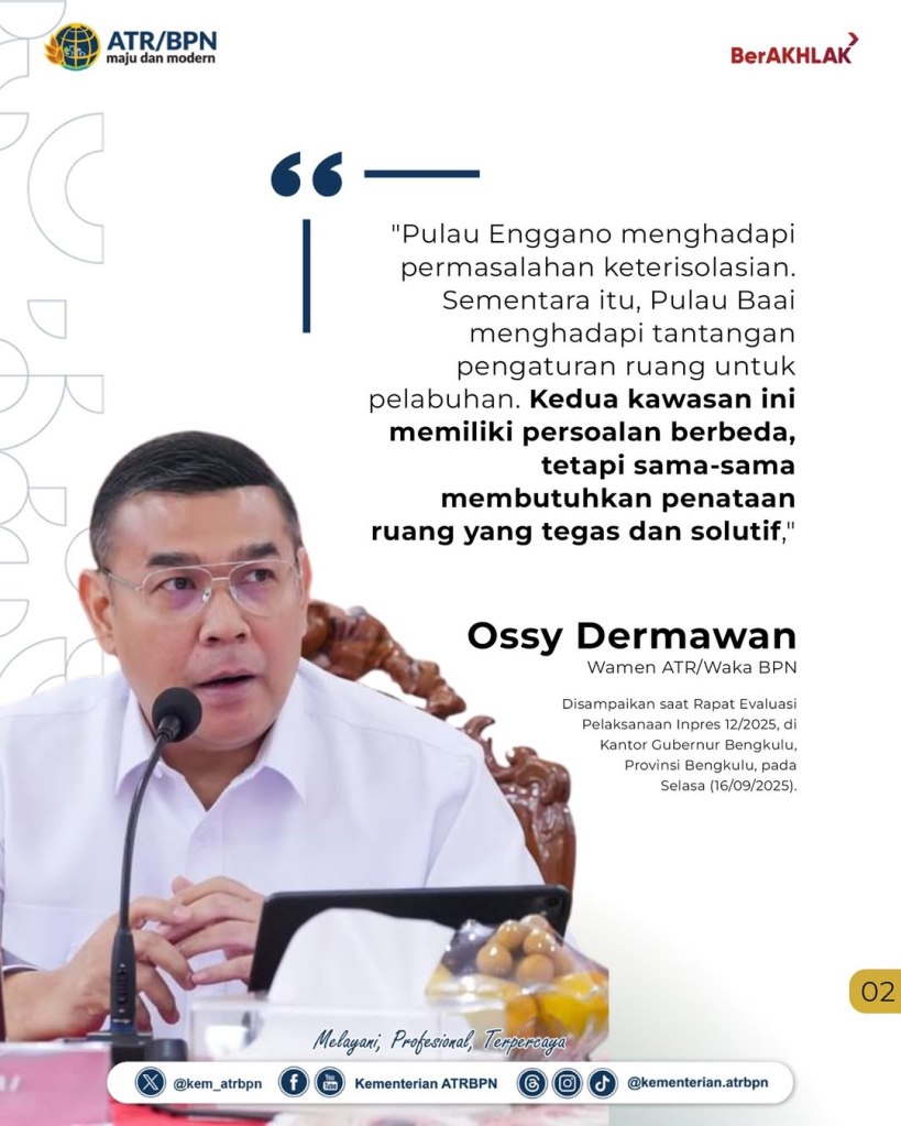 Kementerian Agraria dan Tata Ruang/Badan Pertanahan Nasional (ATR/BPN) menegaskan dukungan terhadap Instruksi Presiden (Inpres) Nomor 12 Tahun 2025 tentang Penanganan Pulau Enggano dan Normalisasi Alur Pulau Baai Bengkulu. Wakil Menteri (Wamen) ATR/Wakil Kepala (Waka) BPN, Ossy Dermawan, dalam Rapat Evaluasi Pelaksanaan Inpres 12/2025 yang diadakan pada Selasa (16/09/2025), mengungkapkan bentuk upaya konkret penanganan masalah di dua pulau itu akan dilakukan melalui penataan ruang.