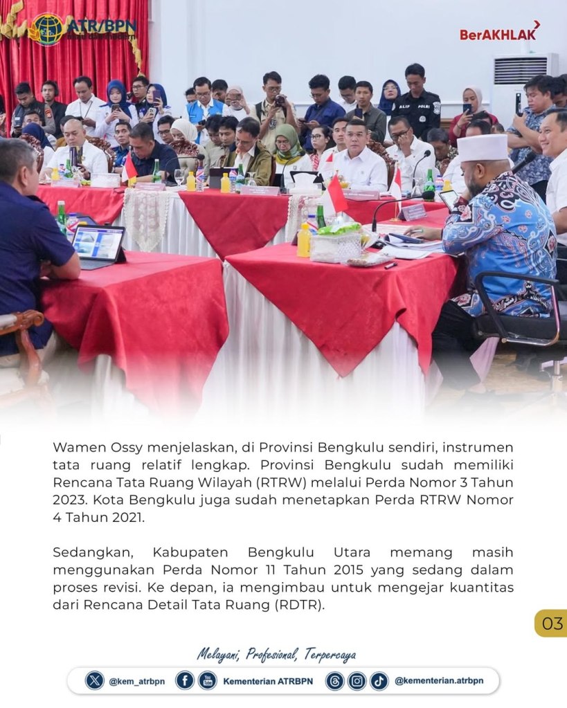 “Pulau Enggano menghadapi permasalahan keterisolasian. Sementara itu, Pulau Baai menghadapi tantangan pengaturan ruang untuk pelabuhan. Kedua kawasan ini memiliki persoalan berbeda, tetapi sama-sama membutuhkan penataan ruang yang tegas dan solutif,” ujar Wamen Ossy di Kantor Gubernur Bengkulu, Provinsi Bengkulu.