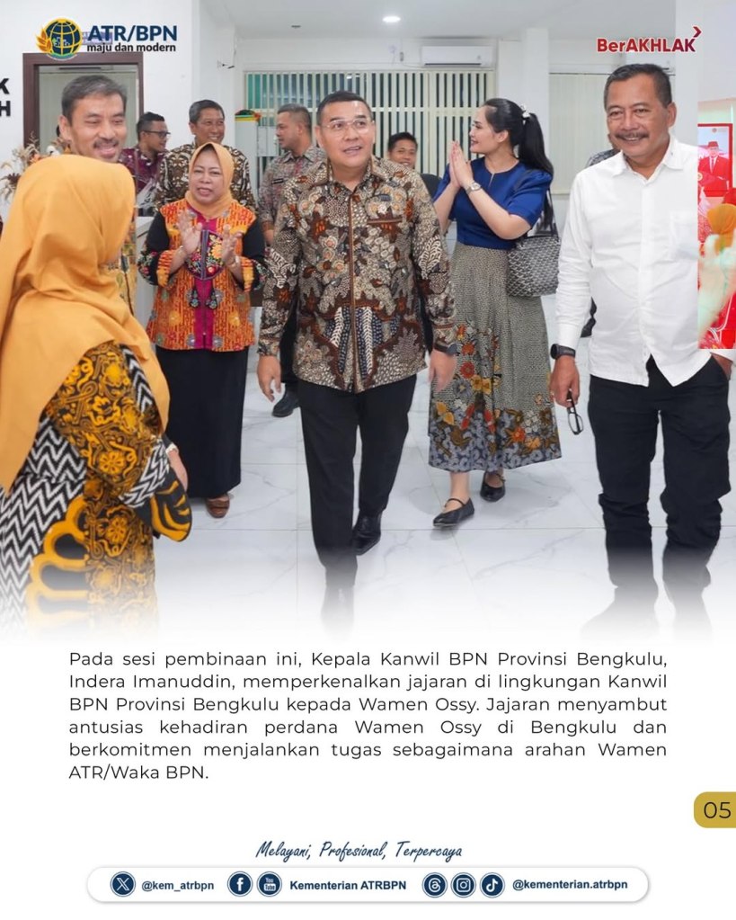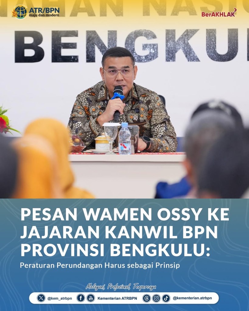 Dalam menjalankan tugas, jajaran Kementerian Agraria dan Tata Ruang/Badan Pertanahan Nasional (ATR/BPN) harus memastikan alur pekerjaan yang dilakukan sesuai dengan peraturan perundang-undangan berlaku. Pesan ini Wakil Menteri (Wamen) ATR/Wakil Kepala (Waka) BPN, Ossy Dermawan, sampaikan saat memberikan pembinaan kepada jajaran Kantor Wilayah (Kanwil) BPN Provinsi Bengkulu, Selasa (16/09/2025).