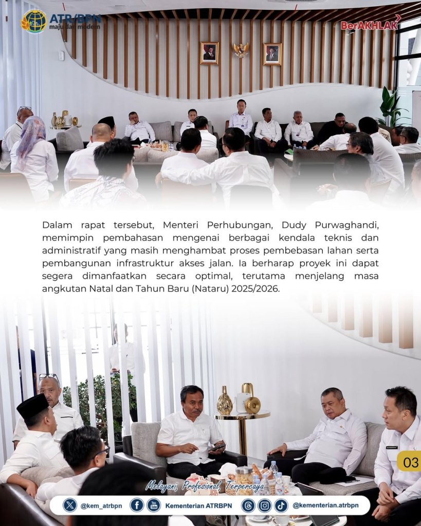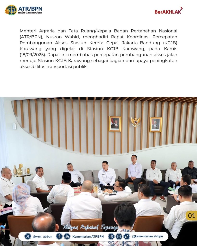 Menteri Agraria dan Tata Ruang/Kepala Badan Pertanahan Nasional (ATR/BPN), Nusron Wahid, menghadiri Rapat Koordinasi Percepatan Pembangunan Akses Stasiun Kereta Cepat Jakarta–Bandung (KCJB) Karawang yang digelar di Stasiun KCJB Karawang, pada Kamis (18/09/2025). Rapat ini membahas percepatan pembangunan akses jalan menuju Stasiun KCJB Karawang sebagai bagian dari upaya peningkatan aksesibilitas transportasi publik.