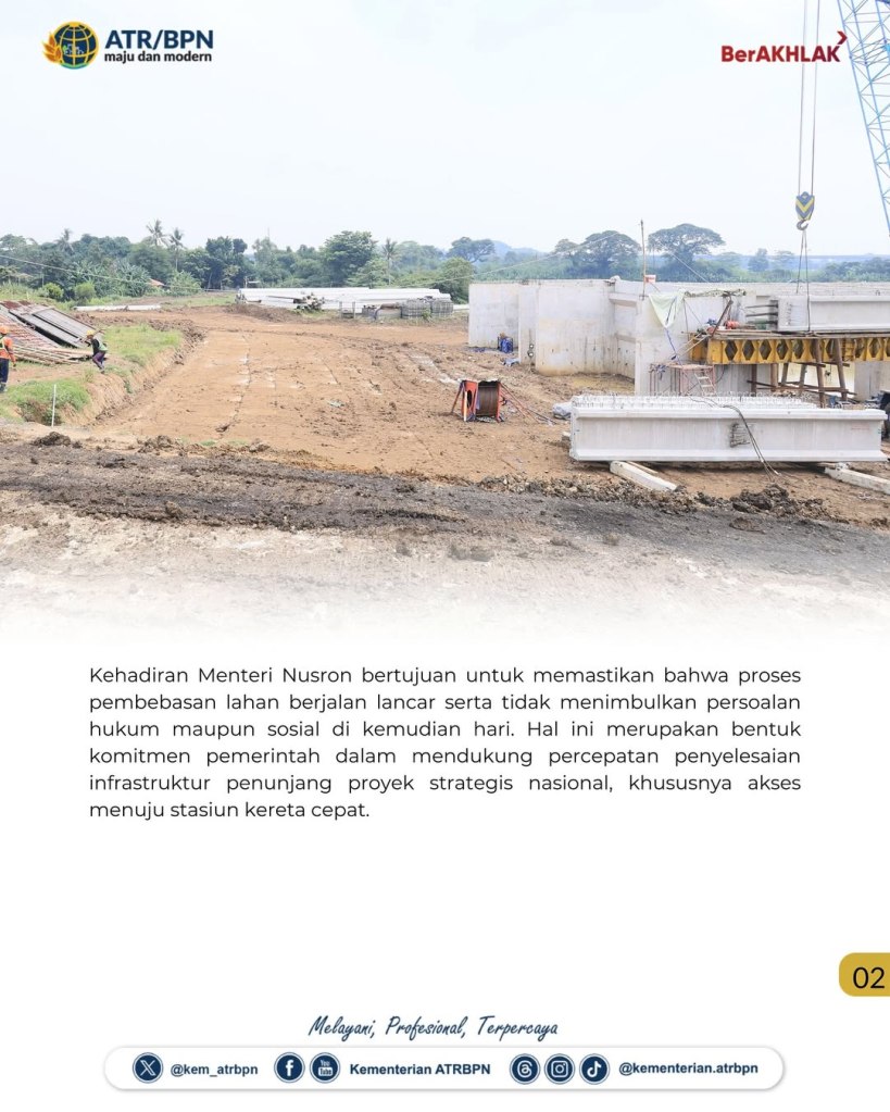 Kehadiran Menteri Nusron bertujuan untuk memastikan bahwa proses pembebasan lahan berjalan lancar serta tidak menimbulkan persoalan hukum maupun sosial di kemudian hari. Hal ini merupakan bentuk komitmen pemerintah dalam mendukung percepatan penyelesaian infrastruktur penunjang proyek strategis nasional, khususnya akses menuju stasiun kereta cepat.