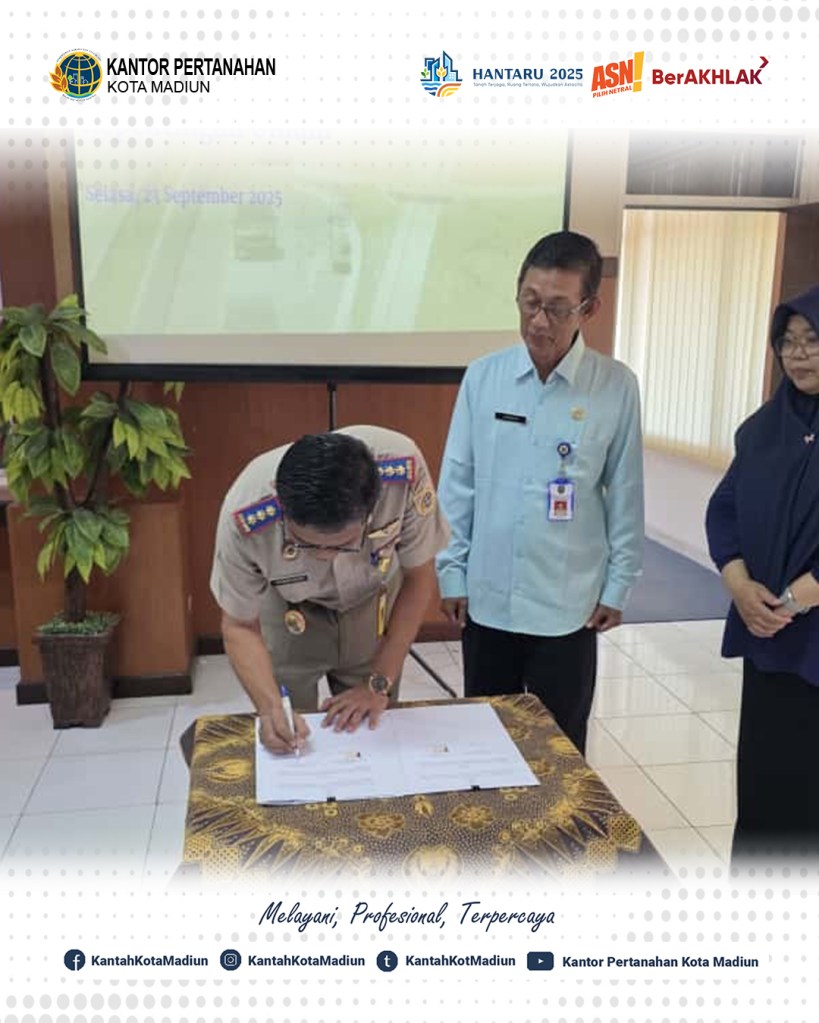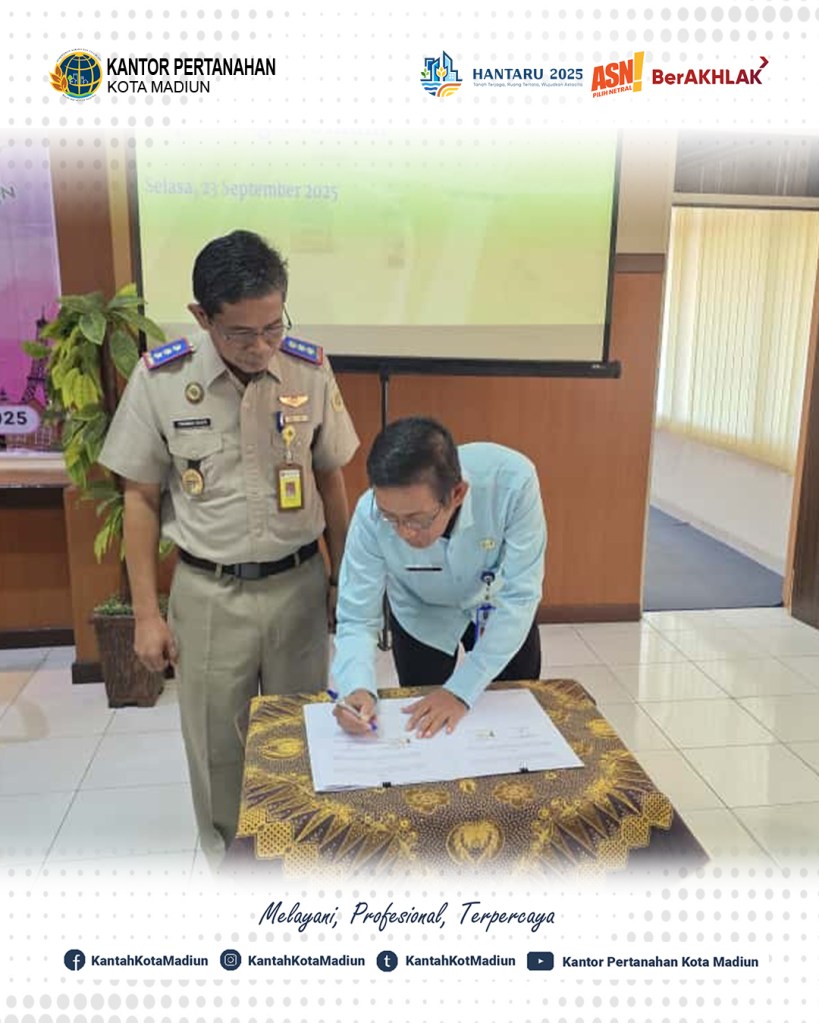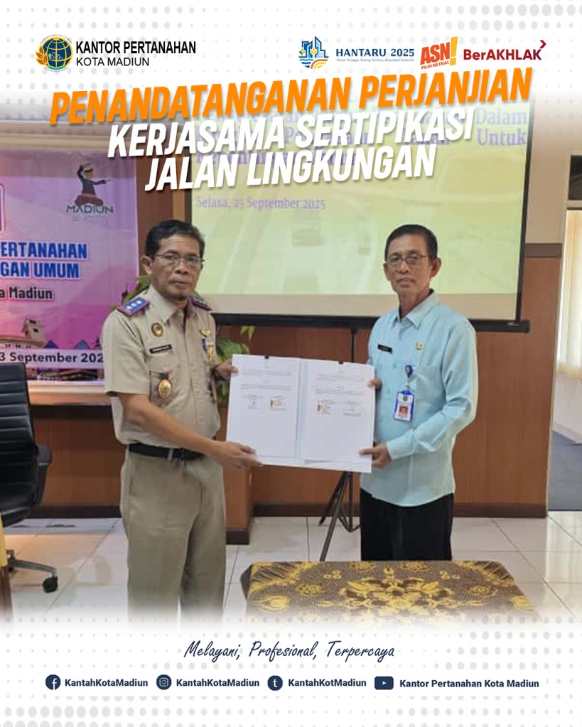 Halo #SobATRBPN, Hari ini Selasa (23/09/2025) Kepala Kantor Pertanahan Kota Madiun, Bapak Triawan Saleh, S.ST., M.Si. dengan Kepala Dinas Perumahan Rakyat dan Kawasan Permukiman, Bapak Jemakir, S.P. melaksanakan penandatanganan Perjanjian Kerja Sama (PKS) Sertipikasi Jalan Lingkungan Kota Madiun.