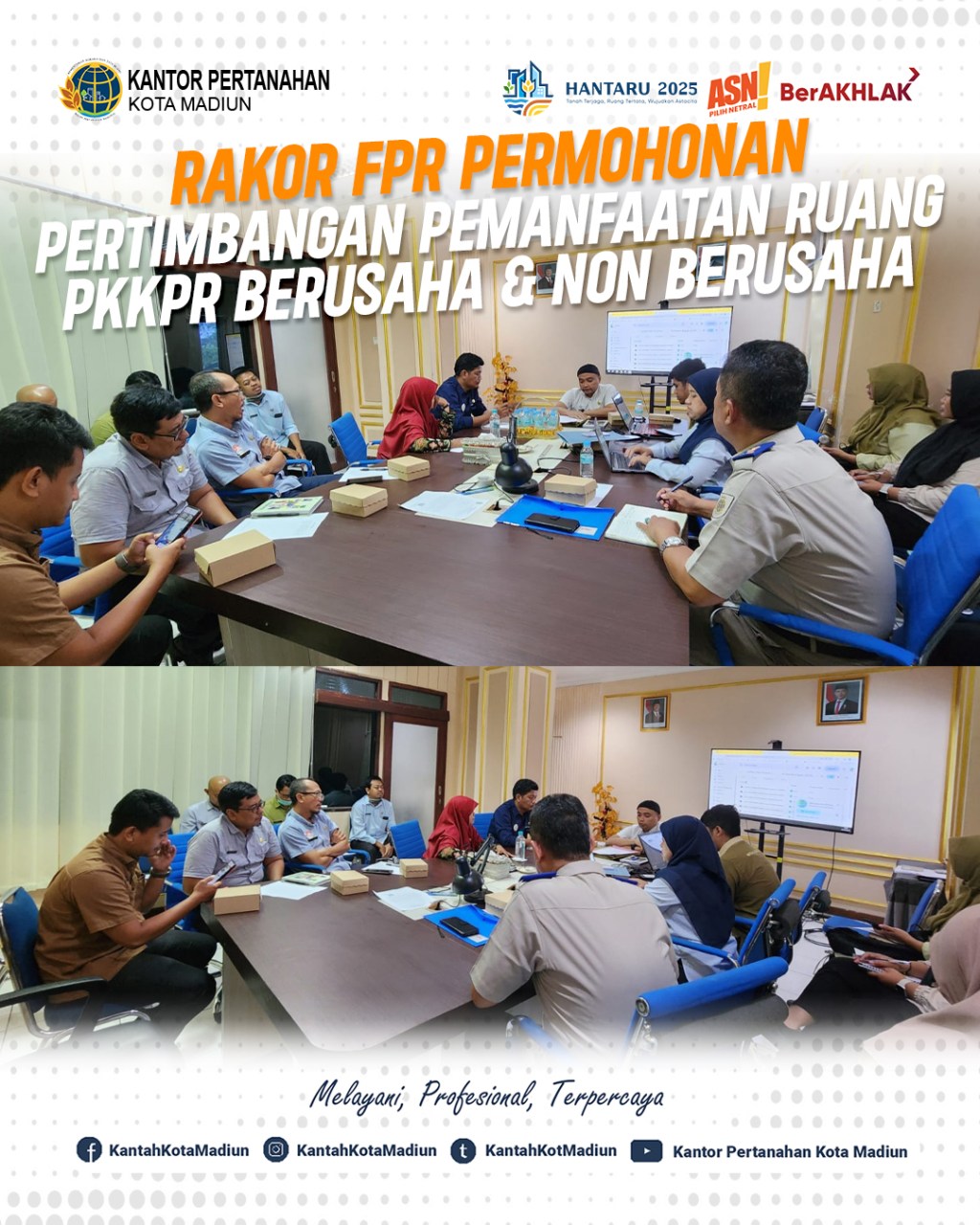 Halo #SobATRBPN, Hari ini Selasa (23/09/2025) Kantor Pertanahan Kota Madiun mengikuti Rapat Koordinasi Forum Penataan Ruang (FPR) Pembahasan Permohonan Pertimbangan Pemanfaatan Ruang untuk Persetujuan Kesesuaian Kegiatan Pemanfaatan Ruang (PKKPR) Berusana dan Non Berusaha yang bertempat di Ruang Rapat Kepala Dinas Pekerjaan Umum dan Penataan Ruang, Jalan D.I. Panjaitan No.17 Madiun.