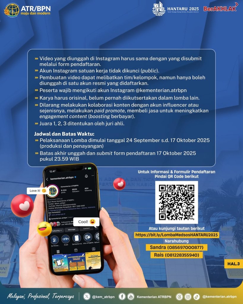 Halo #SobATRBPN, dalam rangkaian perayaan Hari Agraria dan Tata Ruang (HANTARU) 2025, Kementerian ATR/BPN akan menyelenggarakan Lomba Konten Media Sosial.