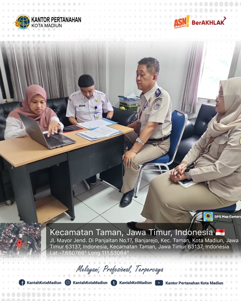 Halo #SobATRBPN, Hari ini Rabu (24/09/2025) Kantor Pertanahan Kota Madiun mengikuti rapat penyusunan dokumen draft Perjanjian Kerjasama tentang “Pemanfaatan Data Pertanahan dalam Rangka Penyusunan Rencana Tata Ruang Wilayah dan Rencana Detail Tata RUang Kota Madiun. Turut hadir Kepala Seksi Penataan an Pemberdayaan, Bapak Dwi Joko Susilo, A.Ptnh., M.M.