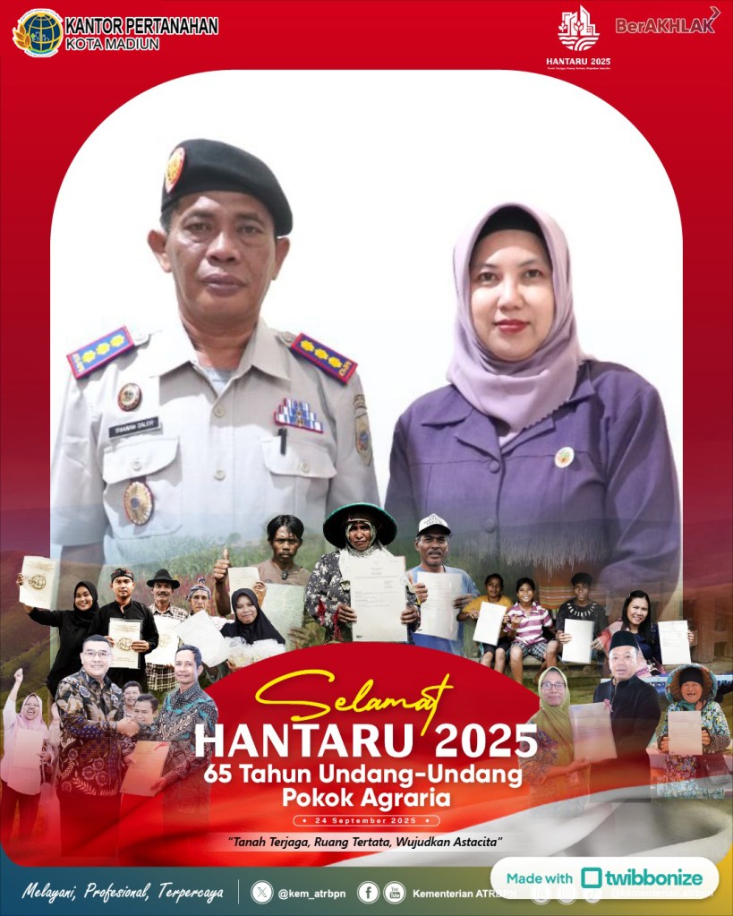 Kepala Kantor Pertanahan Kota Madiun, Bapak Triawan Saleh, S.T., M.Si. dan Segenap jajaran Kantor Pertanahan Kota Madiun mengucapkan Selamat Hari Agraria dan Tata Ruang (HANTARU) 2025 Peringatan ke-65 Tahun Undang-Undang Pokok Agraria (UUPA).
