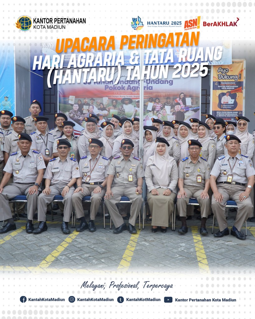 Kepala Kantor Pertanahan Kota Madiun, Bapak Triawan Saleh, S.T., M.Si. dan Segenap jajaran Kantor Pertanahan Kota Madiun mengucapkan Selamat Hari Agraria dan Tata Ruang (HANTARU) 2025 Peringatan ke-65 Tahun Undang-Undang Pokok Agraria (UUPA).