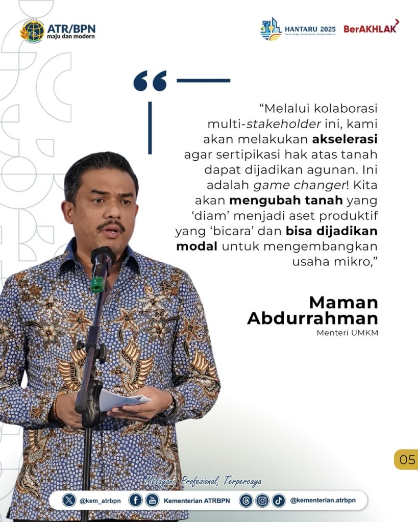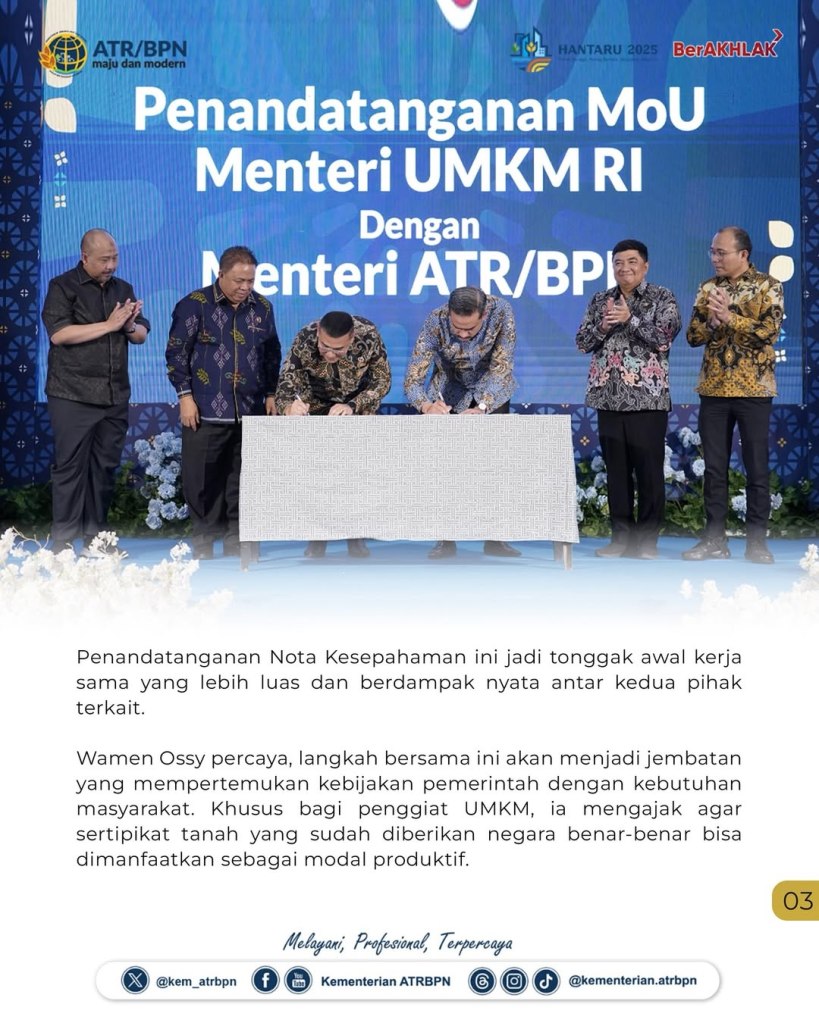 Kementerian Agraria dan Tata Ruang/Badan Pertanahan Nasional (ATR/BPN) memperkuat sinergi lintas sektor yang kali ini ditandai dengan penandatanganan Nota Kesepahaman antara Kementerian ATR/BPN dan Kementerian UMKM, Kamis (25/09/2025). Kerja sama ini menghubungkan dua kebutuhan mendasar masyarakat, yaitu kepastian hukum atas tanah dan akses permodalan untuk mengembangkan usaha.