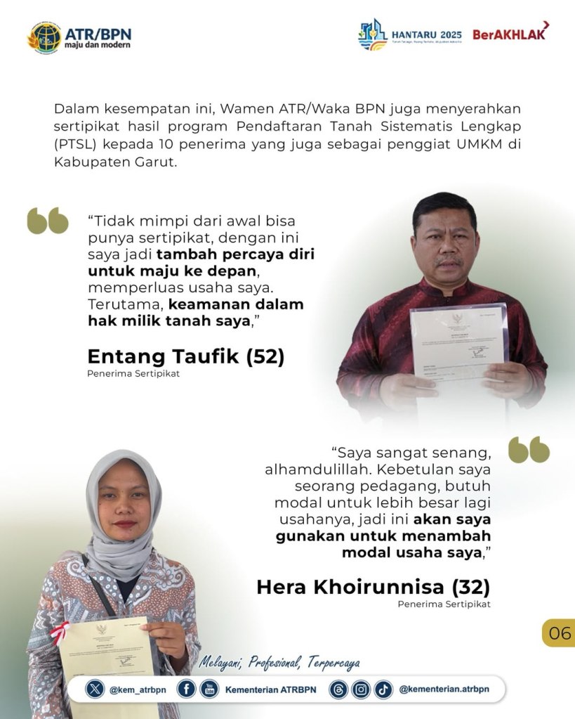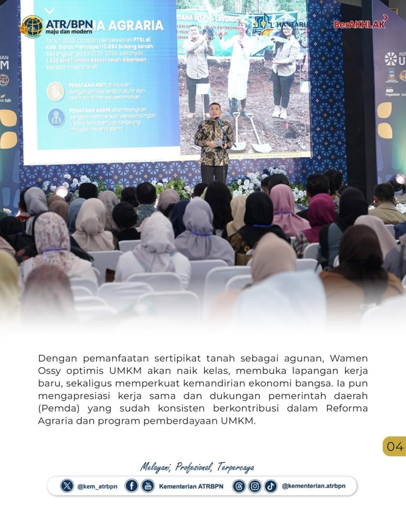 “Sertipikat tanah yang difasilitasi ATR/BPN memberi dasar legal yang kuat, sementara dukungan Kementerian UMKM membuka jalan bagi pelaku usaha untuk mendapatkan pembiayaan. Kolaborasi ini menjadi penting karena langsung menyentuh kebutuhan dasar masyarakat,” kata Wakil Menteri (Wamen) ATR/Wakil Kepala (Waka) BPN, Ossy Dermawan dalam acara Lokomotif Akses Permodalan (LOKAMODAL) di Pendopo Kabupaten Garut.
