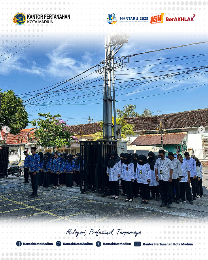 Halo #SobATRBPN, Hari ini Rabu (01/10/2025) mengewali hari pertama Bulan Oktober, Kantor Pertanahan Kota Madiun melaksanakan Upacara Peringatan Hari Kesaktian Pancasila Tahun 2025 yang bertempat di Halaman Depan Kantor Pertanahan Kota Madiun. Yang bertindak sebagai Instruktur Upacara Kepala Kantor Pertanahan Kota Madiun, Bapak Triawan Saleh, S.T., M.Si. dan diikuti oleh Seluruh Pejabat Pengawas dan Jajaran Kantor Pertanahan Kota Madiun.