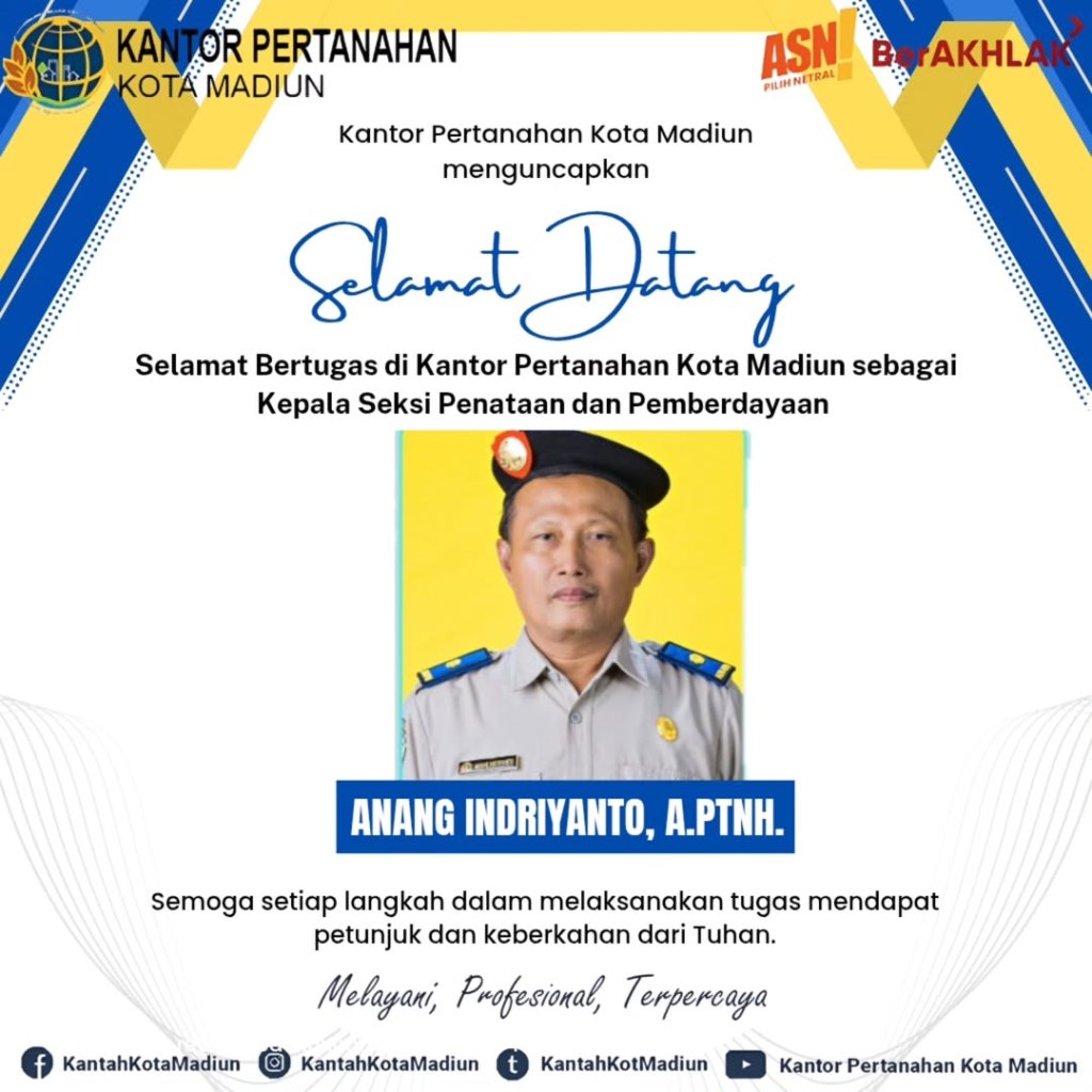 Segenap Jajaran Kantor Pertanahan Kota Madiun Mengucapkan Selamat dan Sukses atas dilantiknya Bapak Anang Indriyanto, A.Ptnh. sebagai Kepala Seksi Penataan dan Pemberdayaan Kantor Pertanahan Kota Madiun.