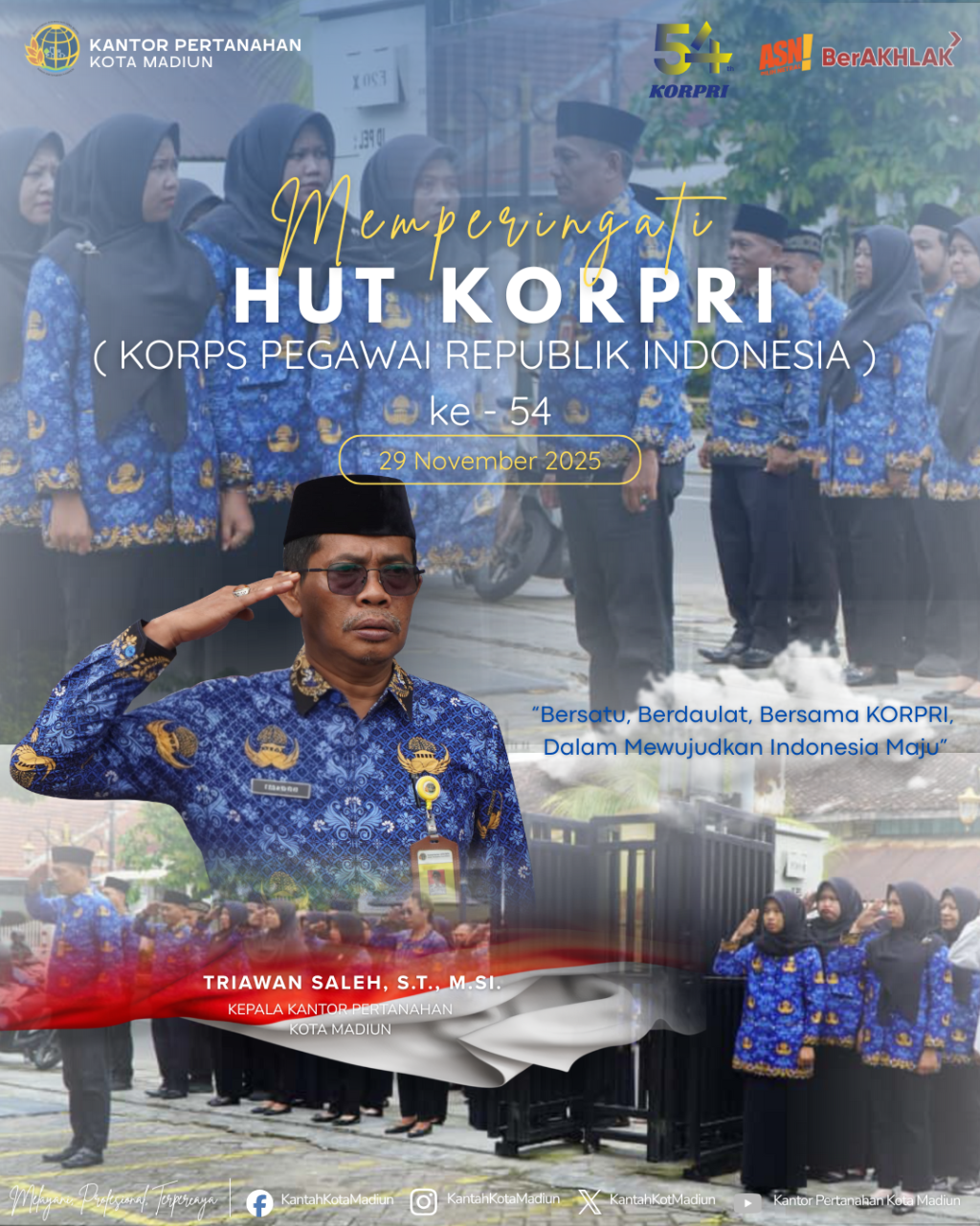 Segenap jajaran Kantor Pertanahan Kota Madiun mengucapkan Selamat Hari Ulang Tahun ke-54 KORPRI yang jatuh pada 29 November 2025 dengan tema “Bersatu, Berdaulat, Bersama KORPRI, Mewujudkan Indonesia Maju.”
