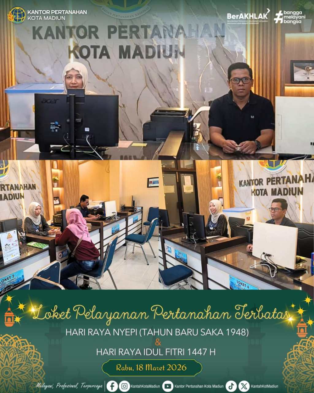 Halo #SobATRBPN Kota Madiun, dalam rangka mewujudkan Komitmen memberikan Layanan Terbaik Kementerian Agraria dan Tata Ruang/Badan Pertanahan Nasional (ATR/BPN). Sehubungan dengan Libur Nasional dan Cuti Bersama Hari Raya Suci Nyepi Tahun Baru Saka 1948 serta Hari Raya Idul Fitri 1447 H, Kantor Pertanahan Kota Madiun”Tetap Buka” dengan Program Layanan Pertanahan Terbatas, pada : Hari / Tanggal : Rabu, Kamis, Jum’at, Senin dan Selasa / 18, 19, 20, dan 24 Maret 2026 Jam / Pukul : 09.00 – 12.00 WIB Khusus Pemohon Langsung Tanpa Kuasa #kotamadiun #Nyepi2026 #pelayananpertanahanterbatas #MelayaniProfesionalTerpercaya