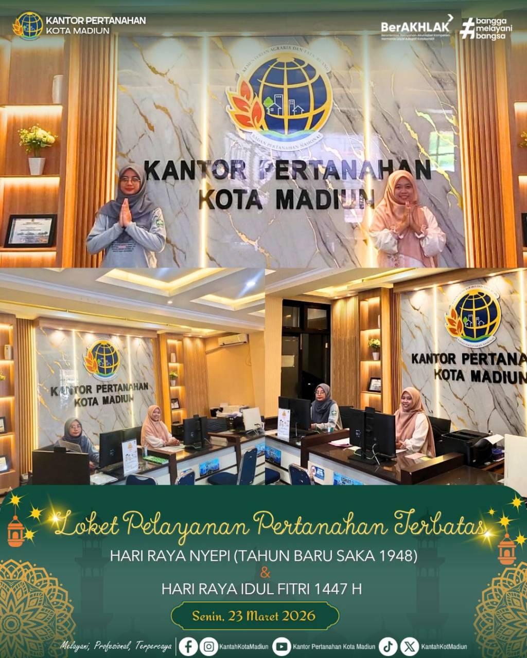 dalam rangka mewujudkan Komitmen memberikan Layanan Terbaik Kementerian Agraria dan Tata Ruang/Badan Pertanahan Nasional (ATR/BPN). Sehubungan dengan Libur Nasional dan Cuti Bersama Hari Raya Suci Nyepi Tahun Baru Saka 1948 serta Hari Raya Idul Fitri 1447 H, Kantor Pertanahan Kota Madiun”Tetap Buka” dengan Program Layanan Pertanahan Terbatas, pada :