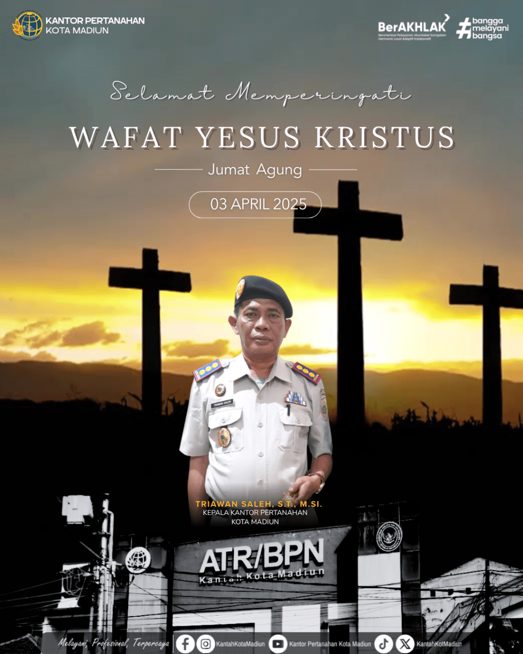 Segenap jajaran Kantor Pertanahan Kota Madiun mengucapkan Selamat Memperingati Jumat Agung 2026 Wafat Yesus Kristus.
